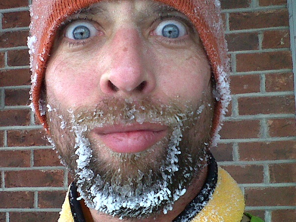 Frozen solid ski mask, with sweat stalactite growing from solid lump of chin ice. Ice Beard level Associate Yeti