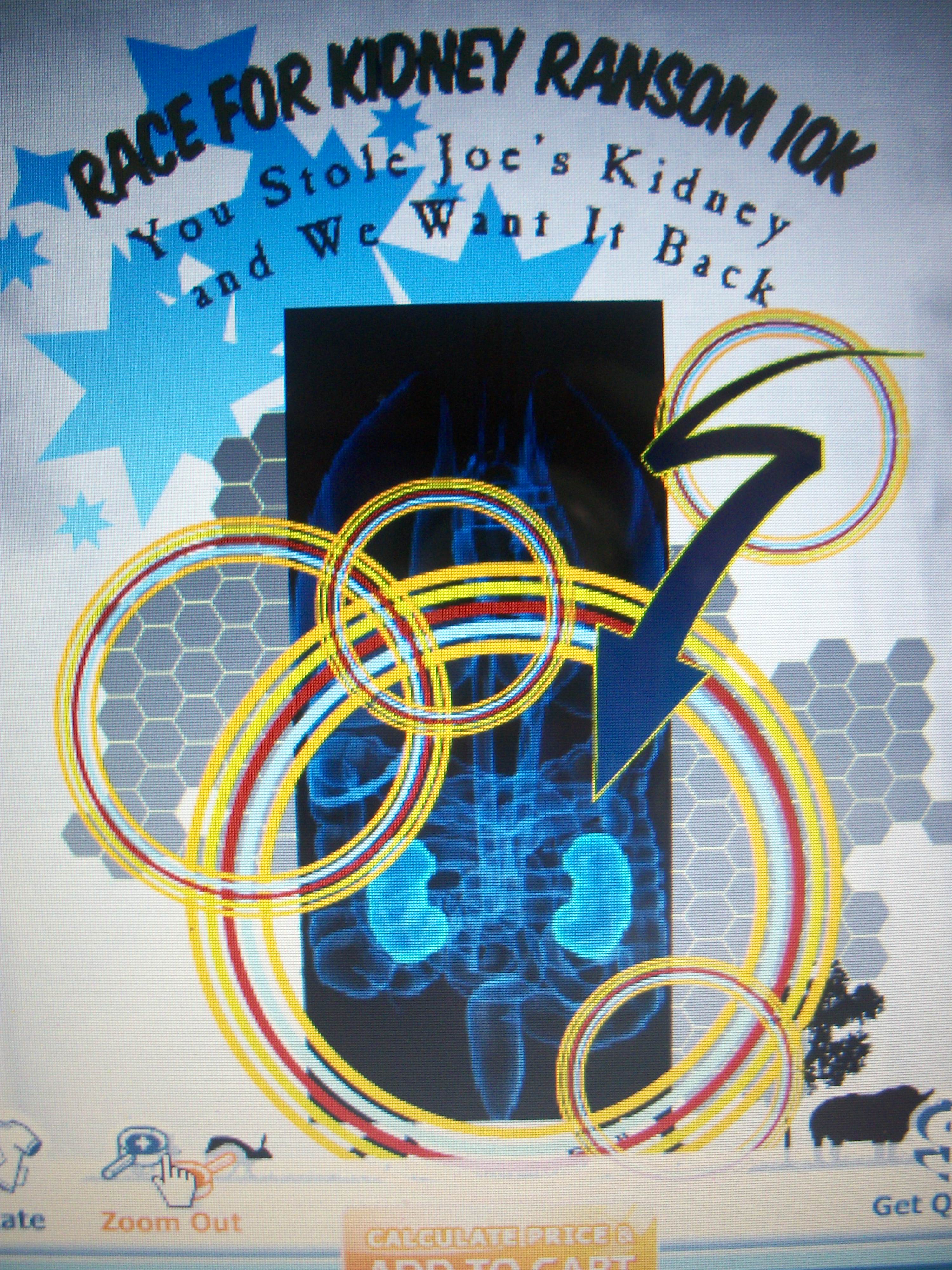 By fiftystatebanana Posted on February 2, 2013February 6, 2013 T-shirt Design for Race for Kidney Ransom 10K This is the front and back of the shirt. It’s from a couple of photos I took of my monitor. I has computers. Front of T-shirt Share this: Share on Reddit (Opens in new window) Reddit Email a link to a friend (Opens in new window) Email Share on Mastodon (Opens in new window) Mastodon Like Loading... Related