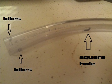 I cut a hole in it midway and cut the trailing edge in such a way that, even if the end of the tube gets sucked to my chest or belly, I can still draw air through the tone hole in the middle. I cut away a section of the trailing end so the tube wouldn’t get sucked directly against my body.The bites are little scores I cut with a pocketknife. The cuts are offset from the curve of the tube slightly, allowing for the tube to tend to right side of my chest. It will protrude outward from my clothing like the breastbone of a bird.