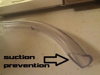 So, I bought a length of tubing to help me breathe the polar air. I bite down on the one end to hold it in my mouth. I cut a hole halfway down its length to increase air flow while reducing suckage.