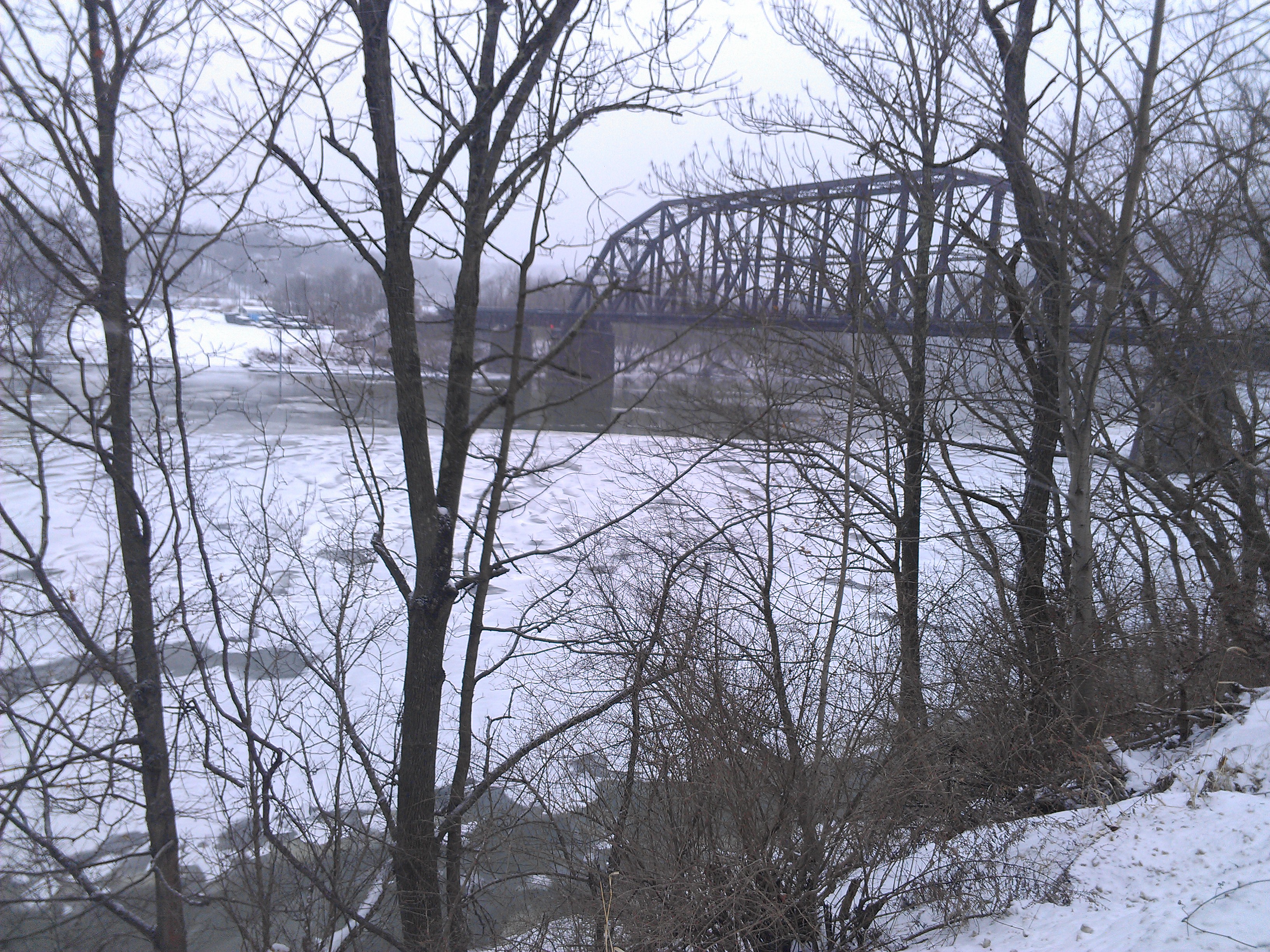 Tugs had chipped up the ice in the middle, and it was gathering in the shoals. At the northern tip of my O&B I saw that the river was completely covered, and snowfall dressed all but the center channel still midnight blue from the most recent tug churning the channel from the coal barges. Snow covered the mile-long coal cars. Snow covered the barges. It was thick and I needed to make some good time, so I didn’t capture the turn-around with my phone camera. The return was mostly into the wind.