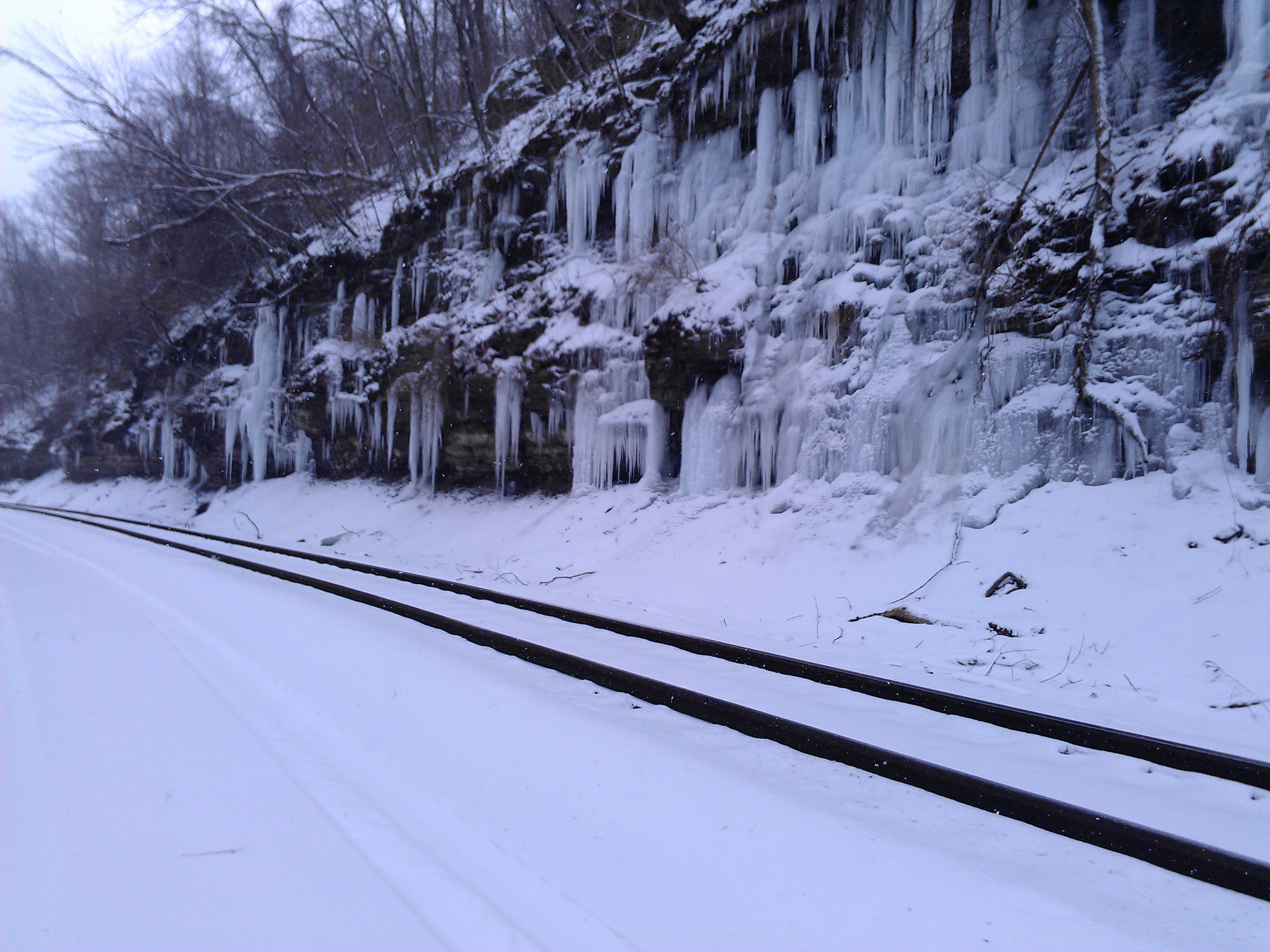 I ran up a stretch of track I’d never run before, and along the way I read the graffiti on trains, some stretching over a mile in length. Rocks had fallen from cliffs, and there was a gusher that froze up some switches out on a lonesome bit. I saw a couple of guys gesticulating at some sunken channels dug out and lined with concrete and old brick, two black eyes receding into the foot of a cliff, almost submerged by the piles of cinder from the railroad. Those tunnels had to be really old. The workers were wearing black slickers with yellow fluorescent strips, like firemen, or miner outfits or something. They said ‘hey’ rather cheerfully to me in passing. I was about 3/4 through the run, coated in ice, shoes looking like I had dunked them in two inches of frosting – thank you wool socks, thank you! – wearing a tiny backpack, running in a snowstorm.