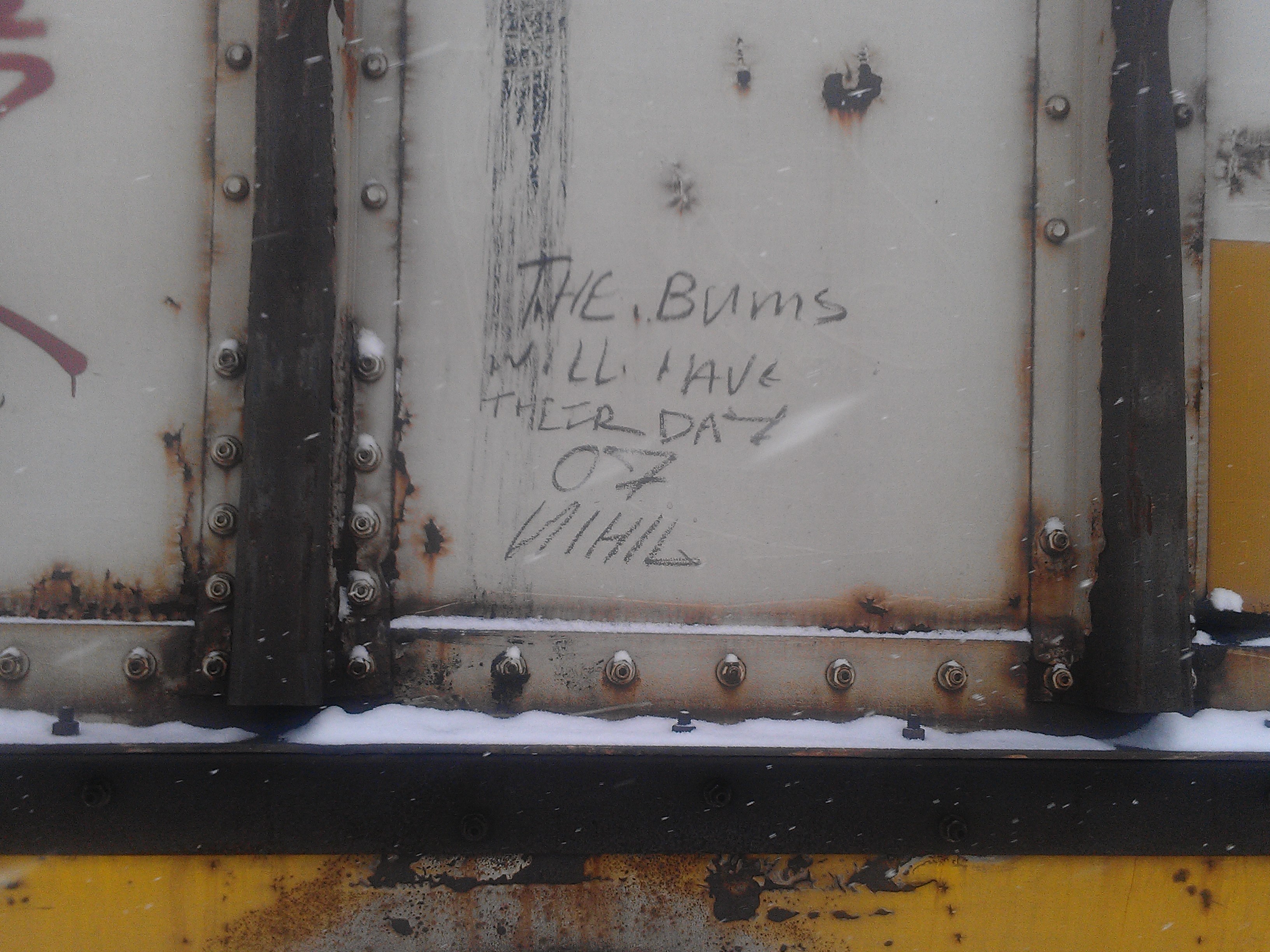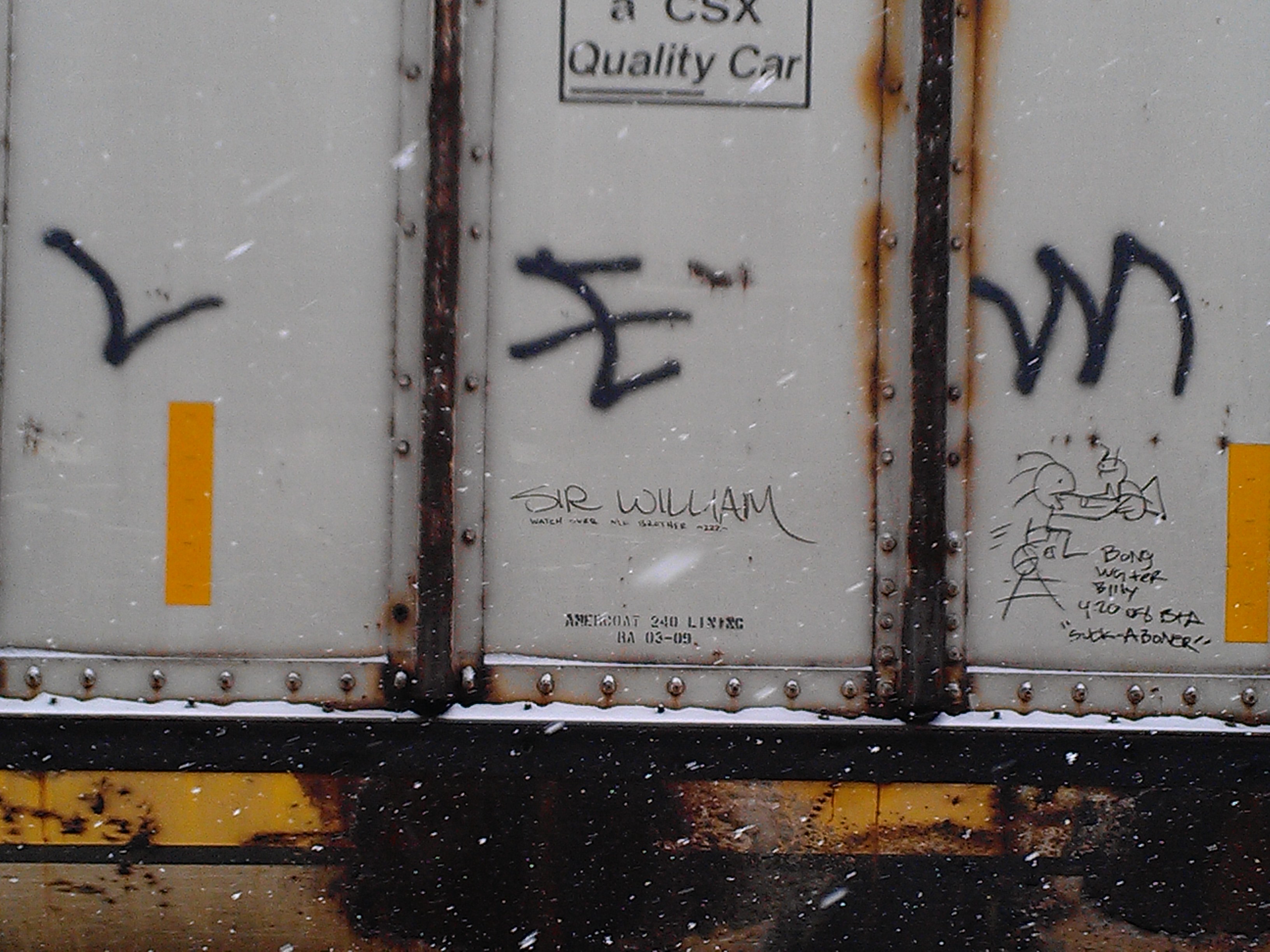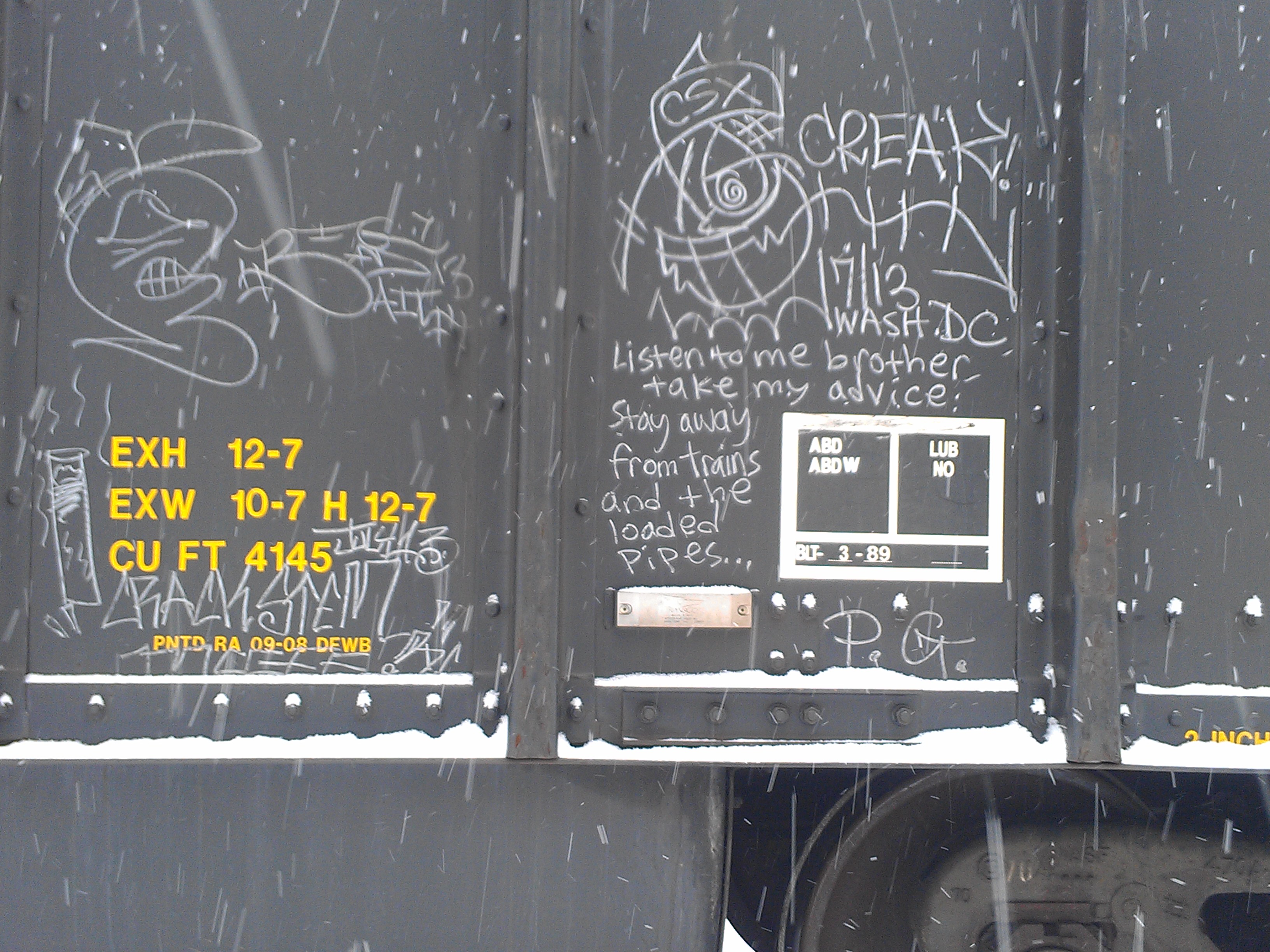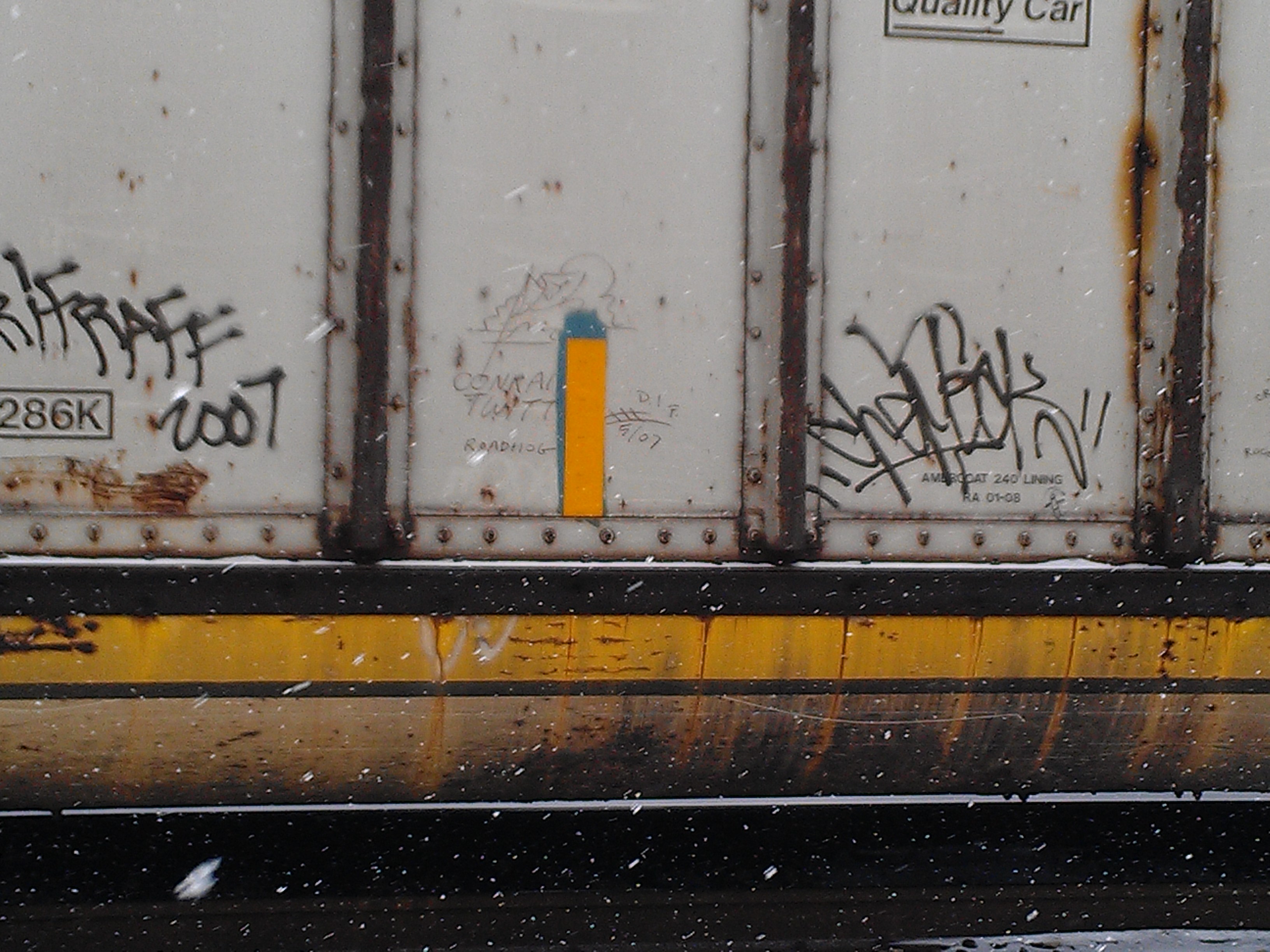 I went for a long run in rural Pennsylvania along railroad tracks and brought a camera. I took shots of boxcar monikers. What would it be like to use coal cars to travel around? The monikers are also made by car inspectors, brakemen, dudes working the rails. Railroads are apparently becoming important again, and I saw monikers dated to last year, “Creak” from D.C.  Hobo culture will never die, it just goes on to the next town…