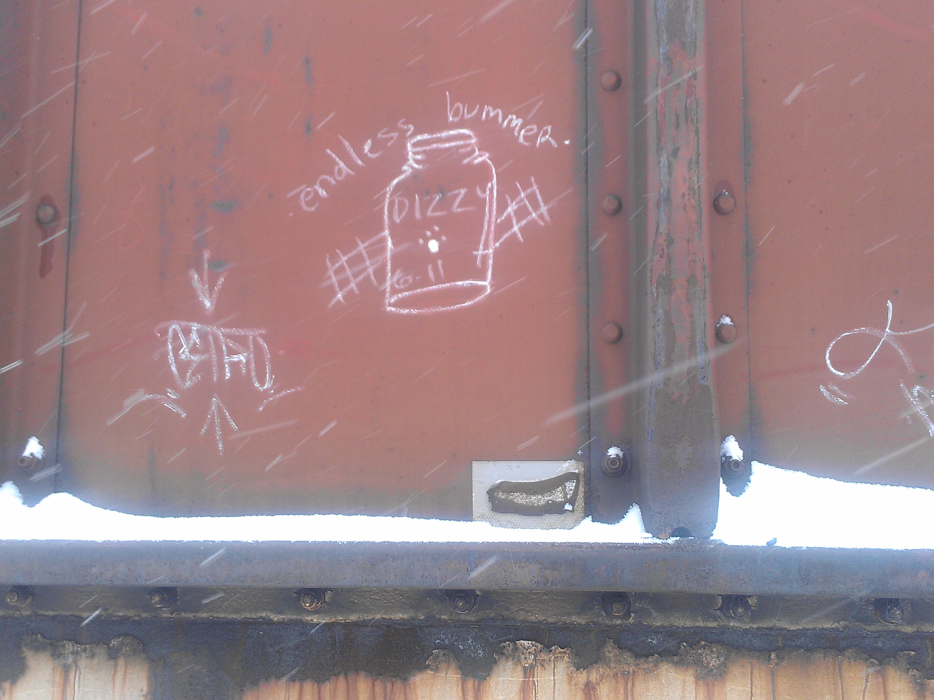 Here’s a great site for hobo signs and their meaning. I didn’t really see any of this stuff on the train. People usually just write out what they want to say.