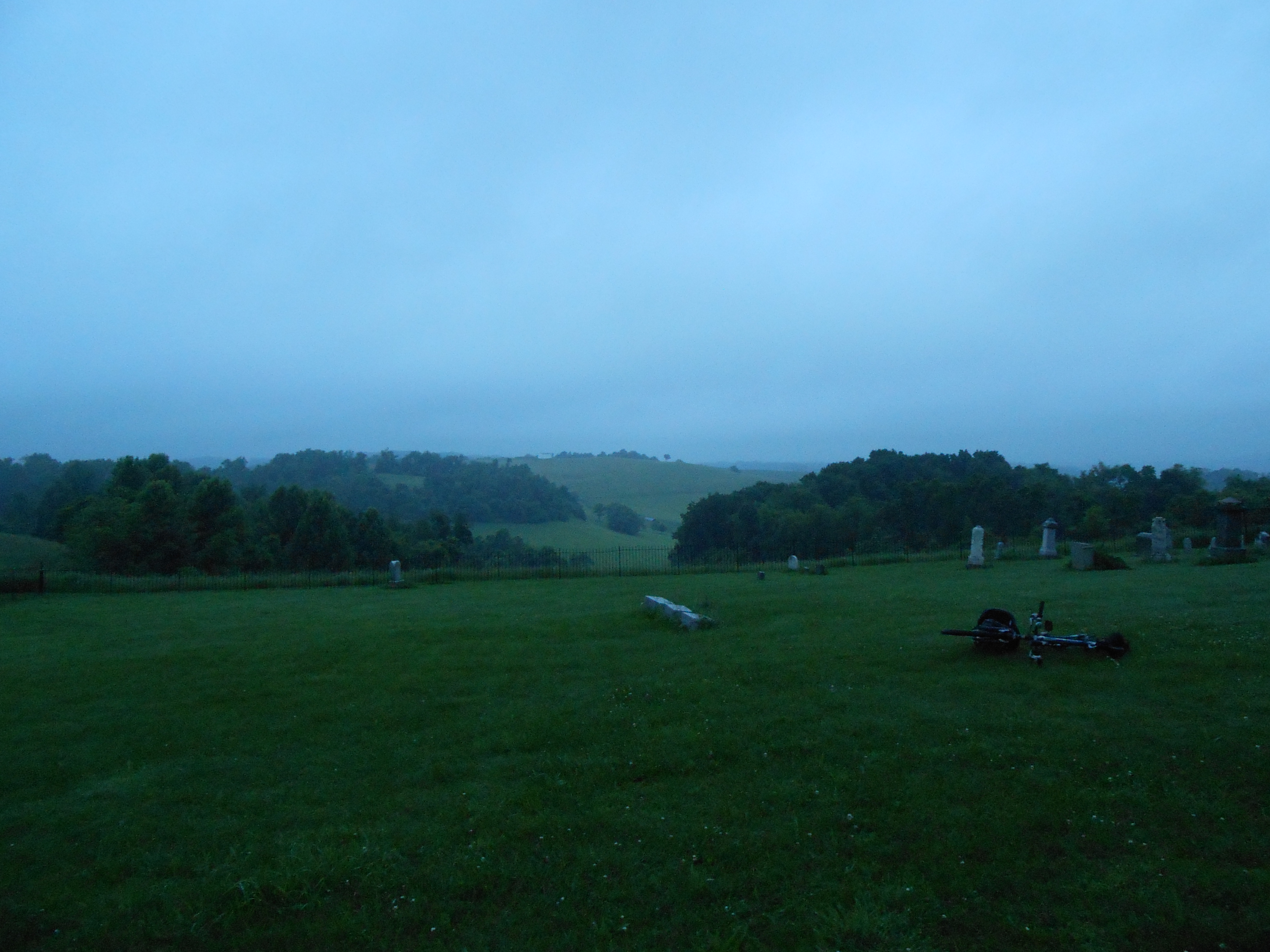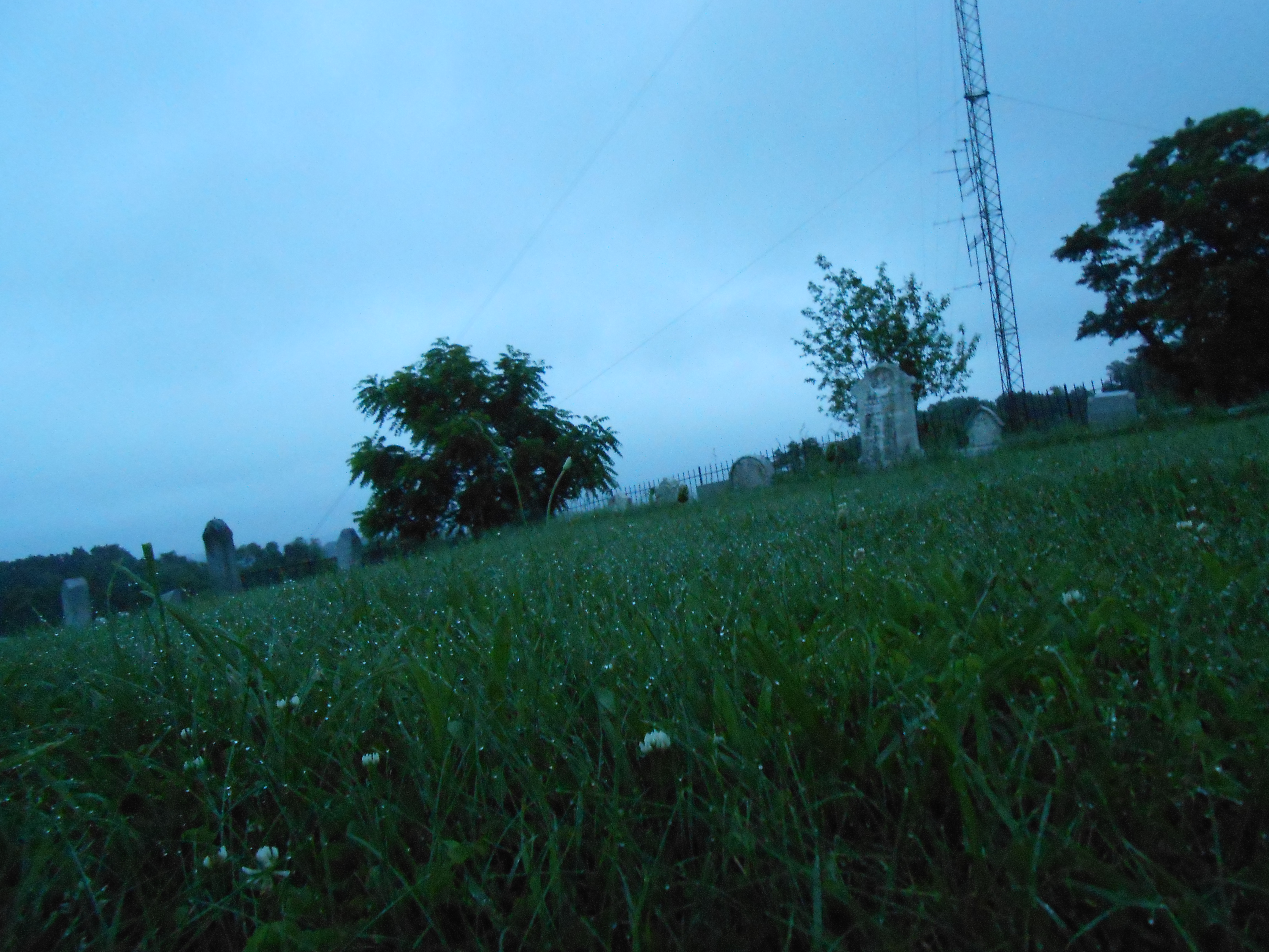 The gloaming held the dew upon every blade of glass like the quicksilver of a million mirrors. The clover was in bloom. The mists were retreating before the ripening dawn. Overhead, the sky was heavy with clouds, and I stood in the faintest of drizzles, refreshing after the ride. I parked my bike behind the church so as to not attract attention from passers-by. I had a compass and checked the position of the church. It faced due south. I toured the cemetery.