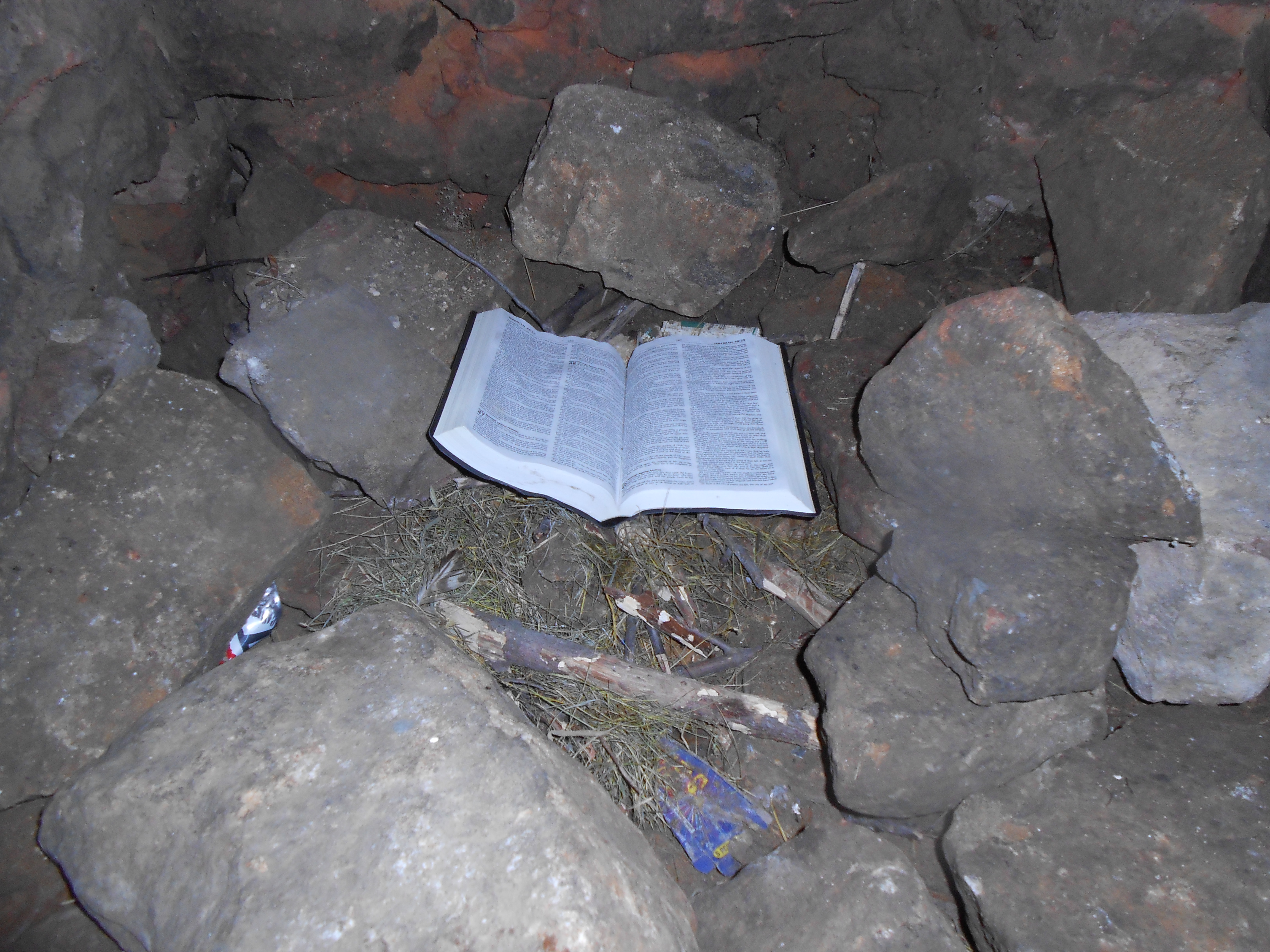 In the eastern fireplace someone had placed a Bible open to a page about halfway through it. It lay on the rubble of the rocks pulled from the flue by the geocache hunters. I couldn’t make out the page and I didn’t want to stick my head in a chimney to read it. There was trash on the dirt floor, a penis spray-painted on a wall. Some of the roofing slats had been ripped away, though under the ribbed tin roof, the room was pretty dark. It was just a squat, rectangular room with two fireplaces that looked unused for long time.