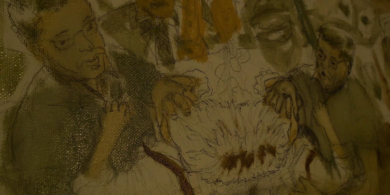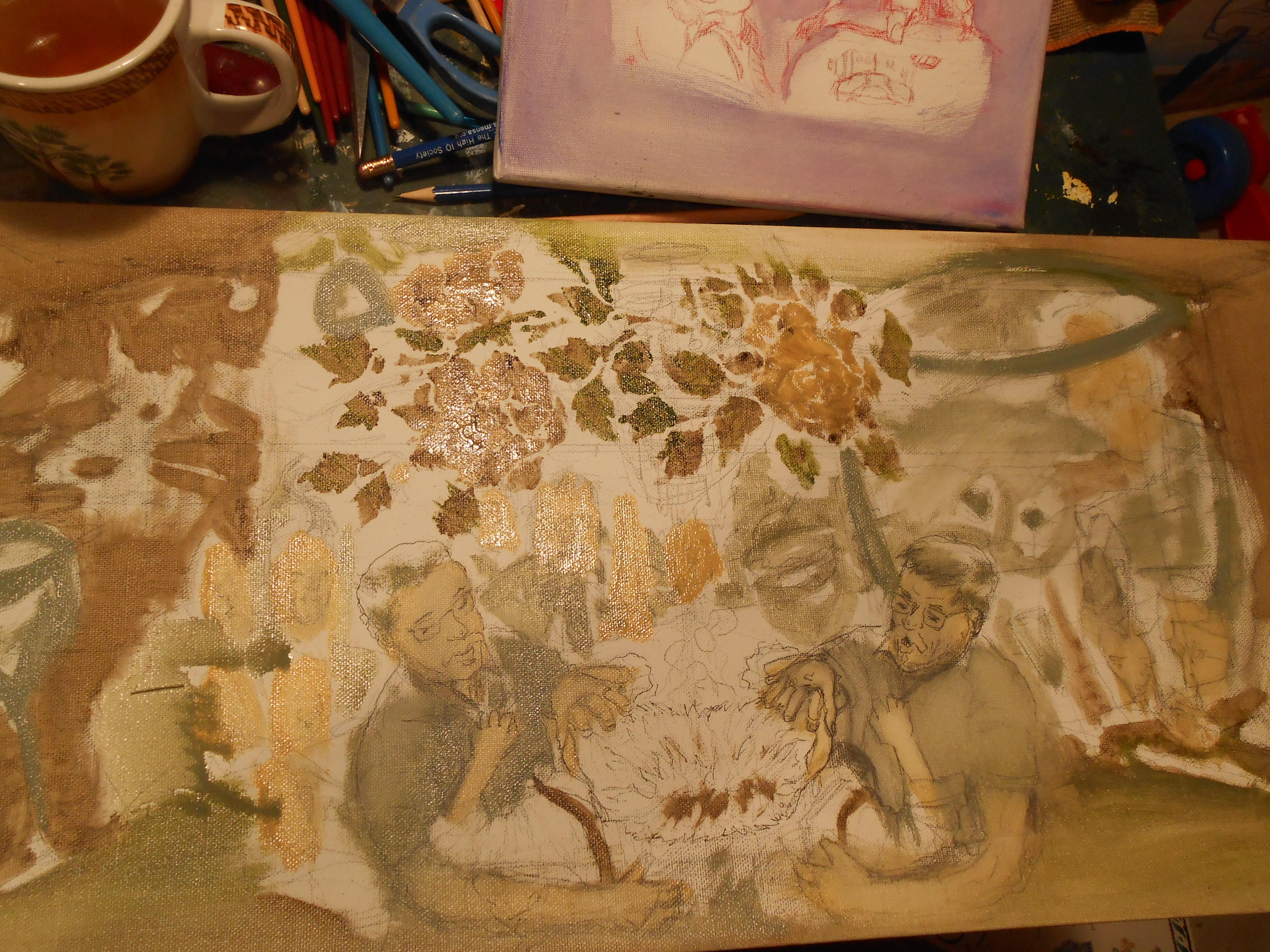 By fiftystatebanana Posted on March 2, 2015March 2, 2015 Oil painting in progress – A Time to Heal Twin preachers performing a two-headed exorcism on a demon child at a wedding reception. Typical Monday. . A Time to Heal detail Share this: Click to share on Reddit (Opens in new window) Reddit Click to email a link to a friend (Opens in new window) Email Click to share on Mastodon (Opens in new window) Mastodon Like Loading... Related
