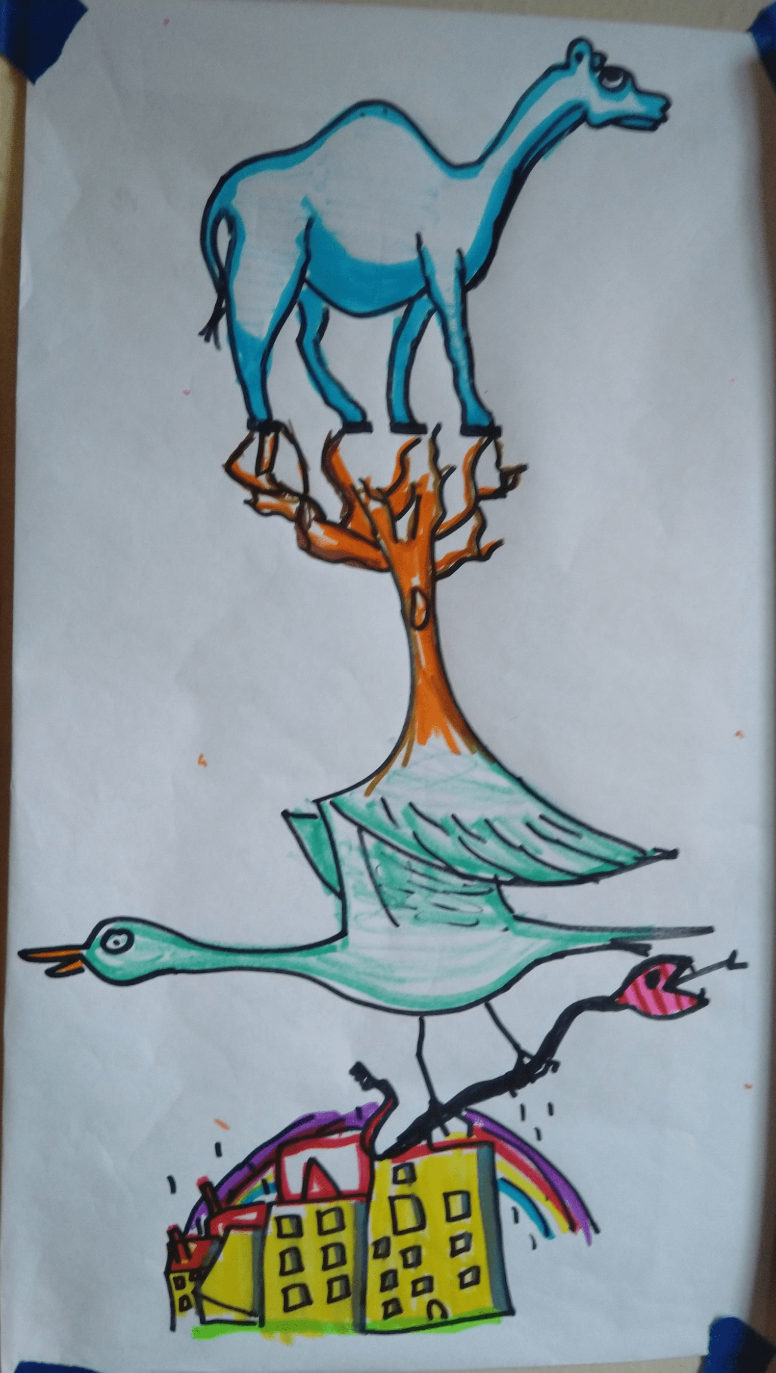 My eleven-year-old son and I drew this collage before breakfast. He named it. After breakfast, we colored but did not embellish the drawing. The style of the drawing is called “exquisite corpse”, cadavre exquis, for some reason. Probably a textualization of this process.