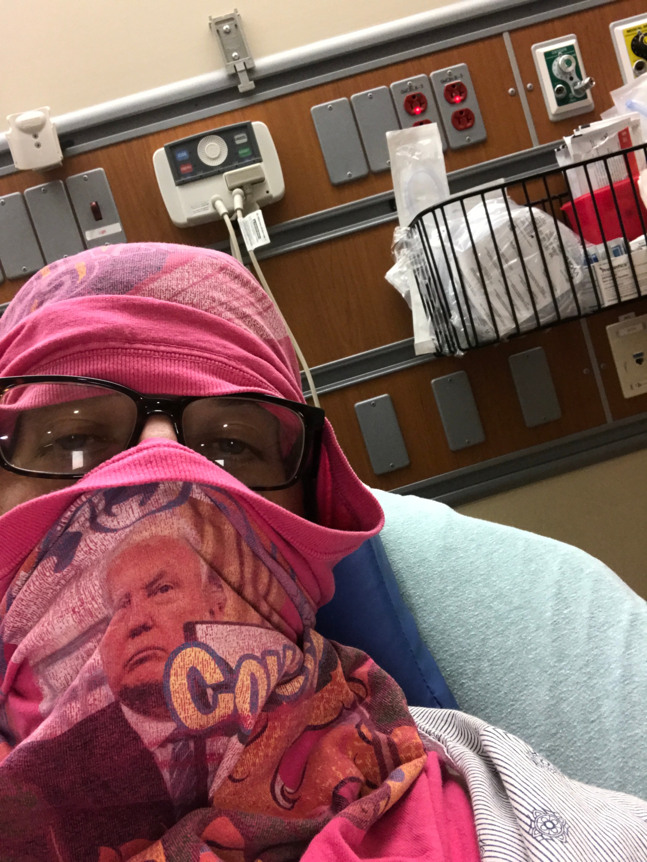 I am recovering on antibiotics in quarantine. I ordered respiratory masks a week ago but they have yet to arrive so I am wearing a shirt on my head that has an image of Trump signing a covfefe order, and the back says “Howbow 2017“.