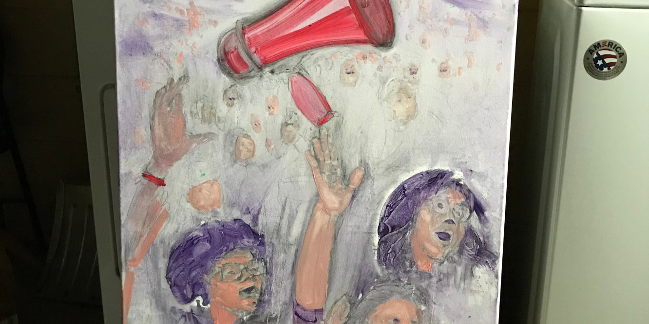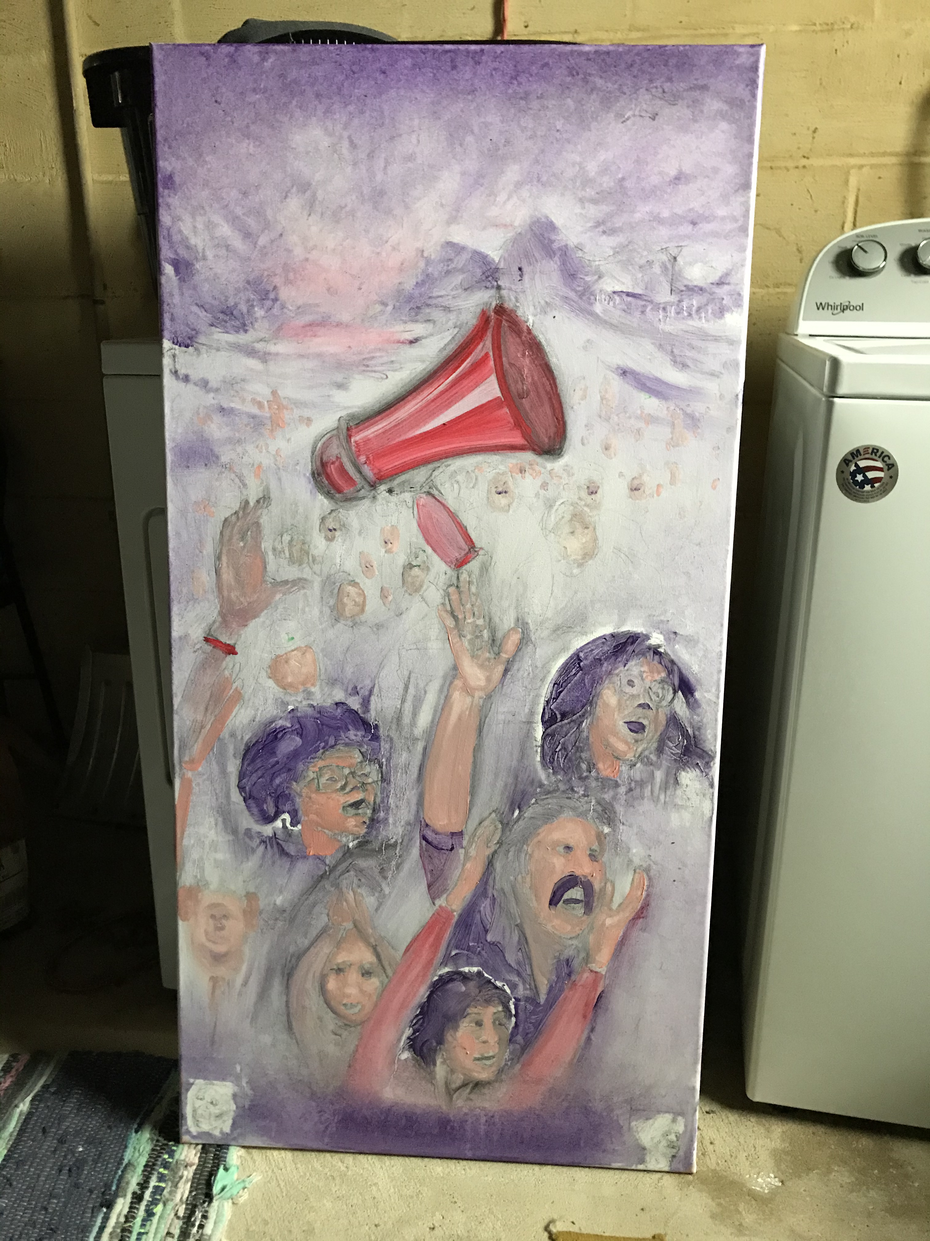 Two of the characters wear eye glasses. My wife insisted I make them big. That’s how the creative process works. They are big glasses. The eyeglasses on the left hand lady are thick and worn low. Maybe you can’t see that. The oil painting is in progress. The people gathered in the background are from an image of determined sex workers sitting cross-legged and planning a union. The context is interesting, I guess. There are sky buckets beyond them, and there will be a wind farm and other details.