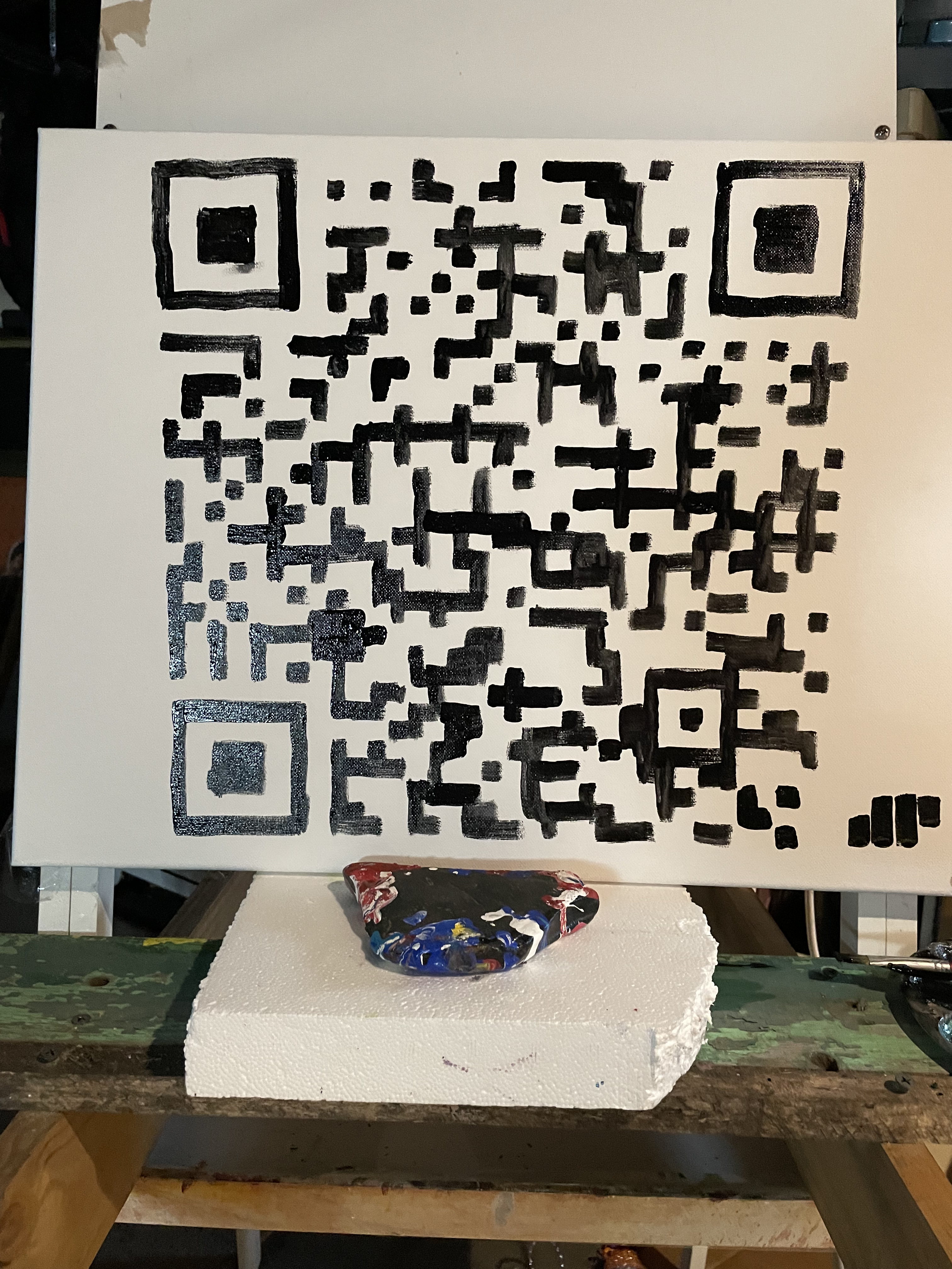 By fiftystatebanana Posted on June 9, 2021June 9, 2021 Oil painting of a QR code of a Steven Wright joke Oil on canvas, 16” x 20”, visionary Share this: Click to share on Reddit (Opens in new window) Reddit Click to email a link to a friend (Opens in new window) Email Click to share on Mastodon (Opens in new window) Mastodon Like Loading... Related