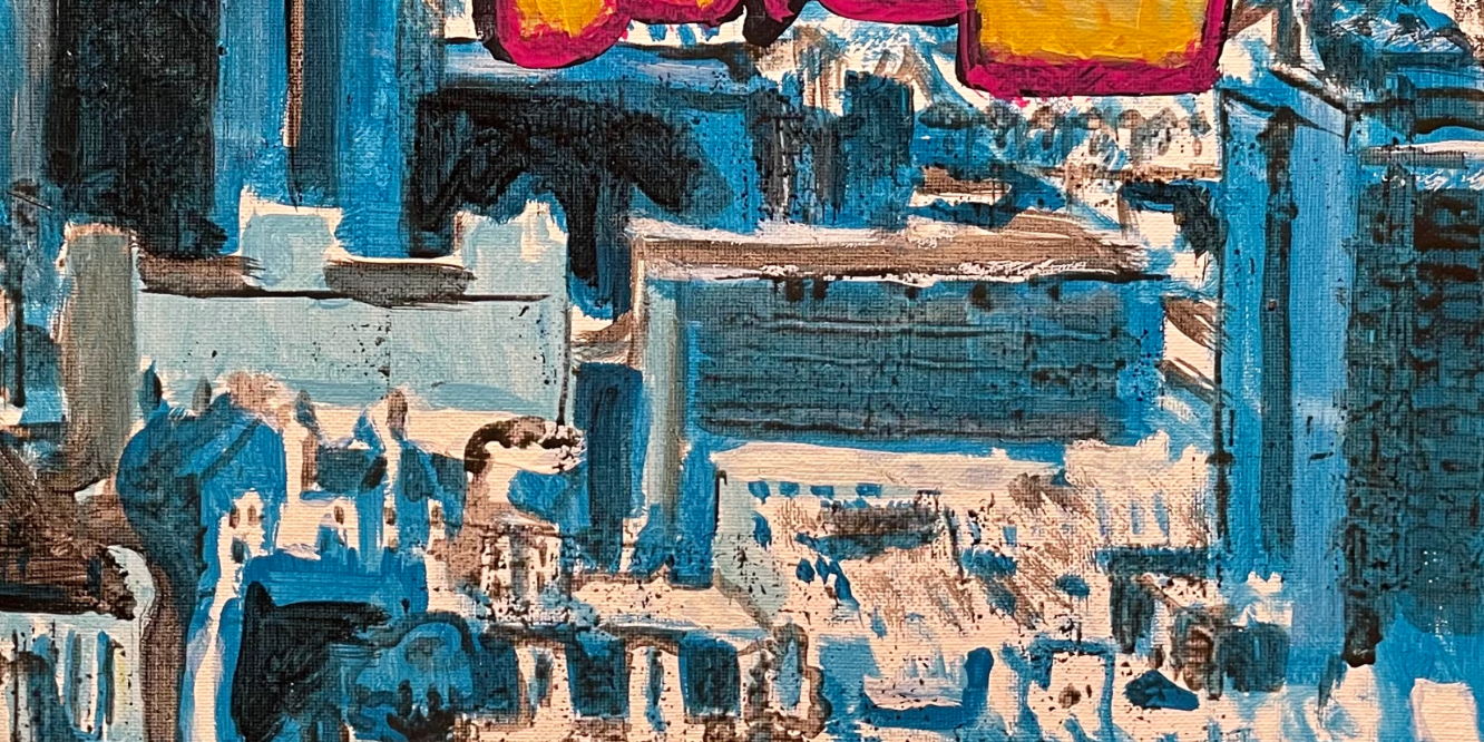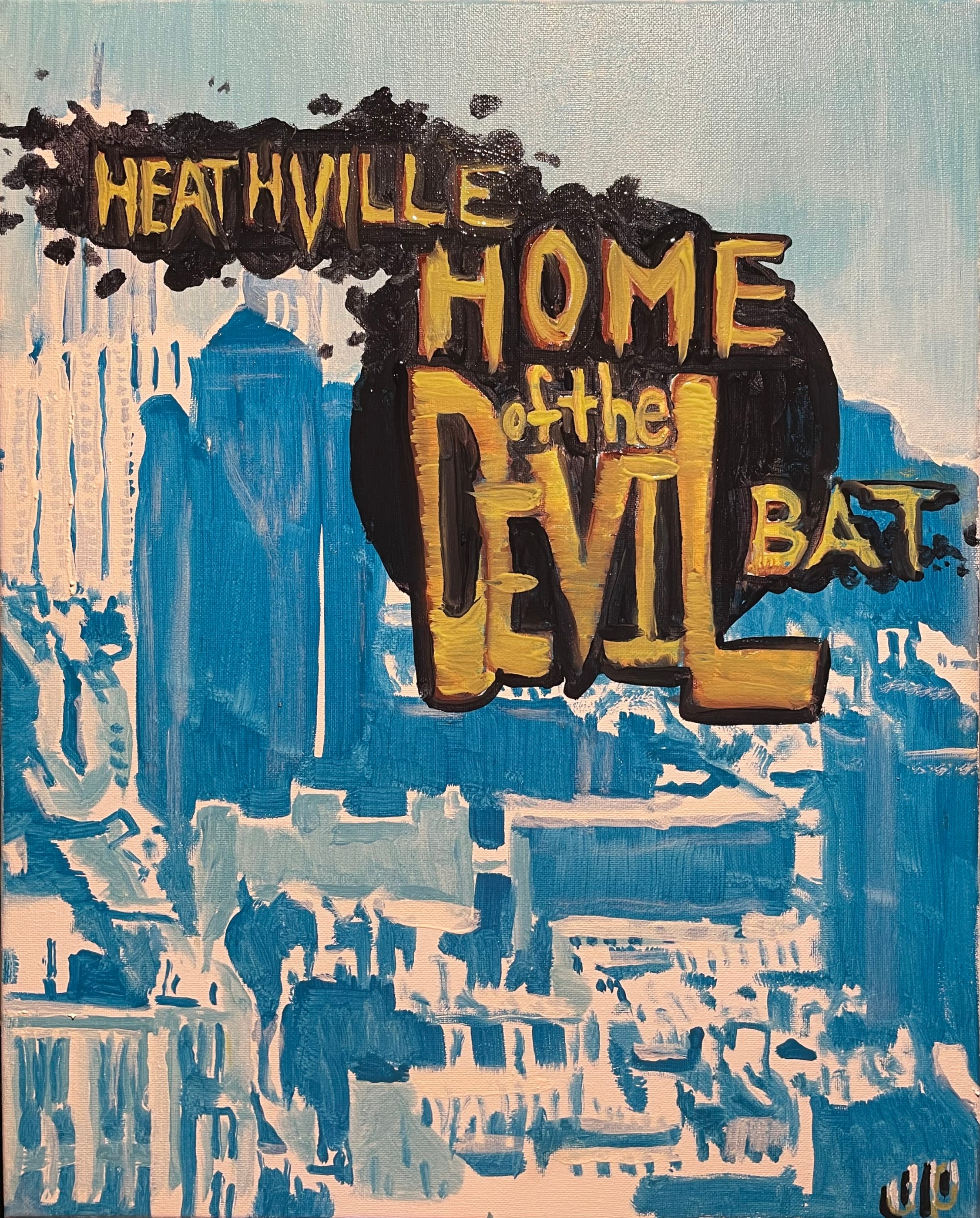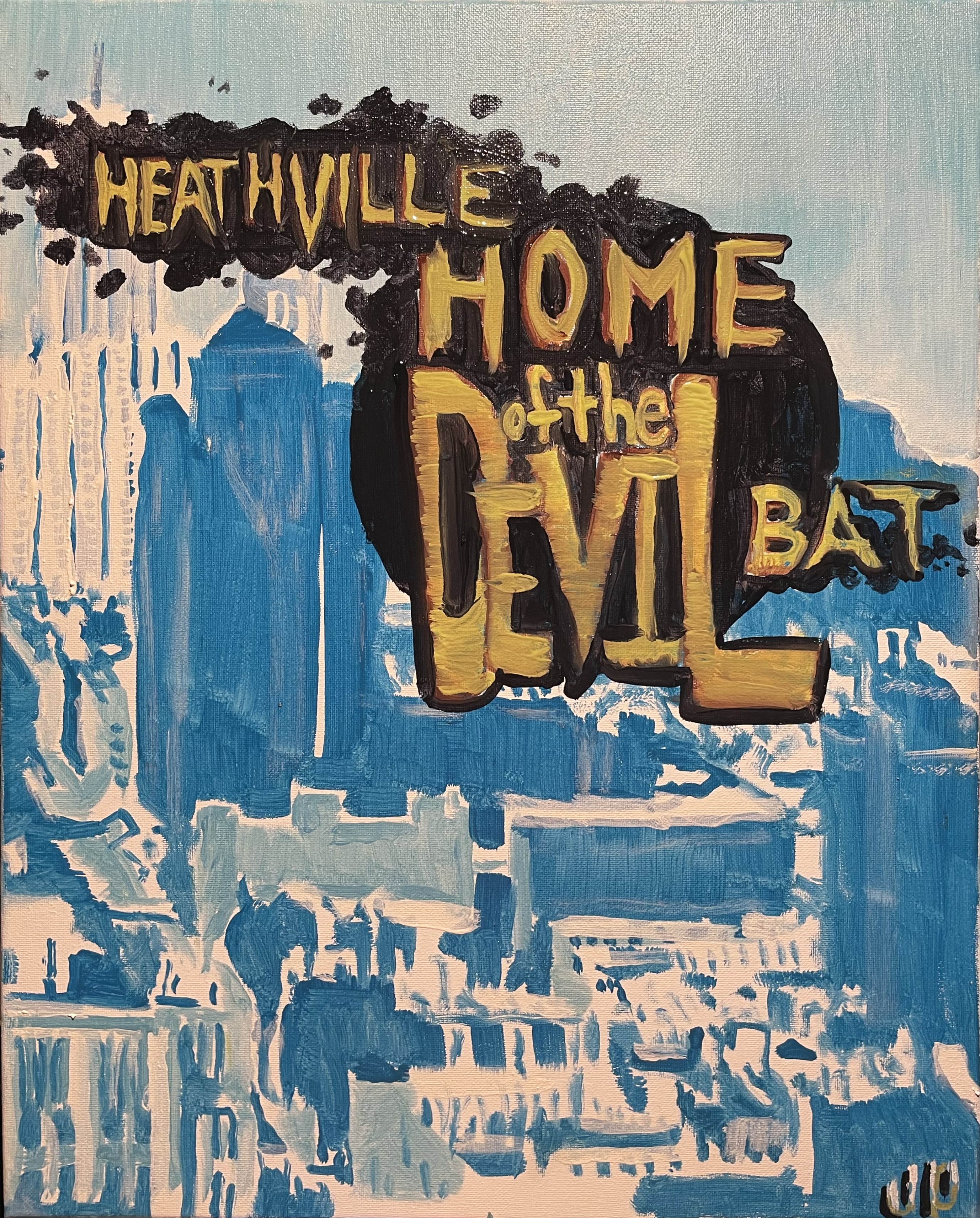 I added the lurid title for this stage of the painting. I am going to use squeeze bottles to lay out the fine structure details in the architecture. I am also going for an engraved look for the sky.