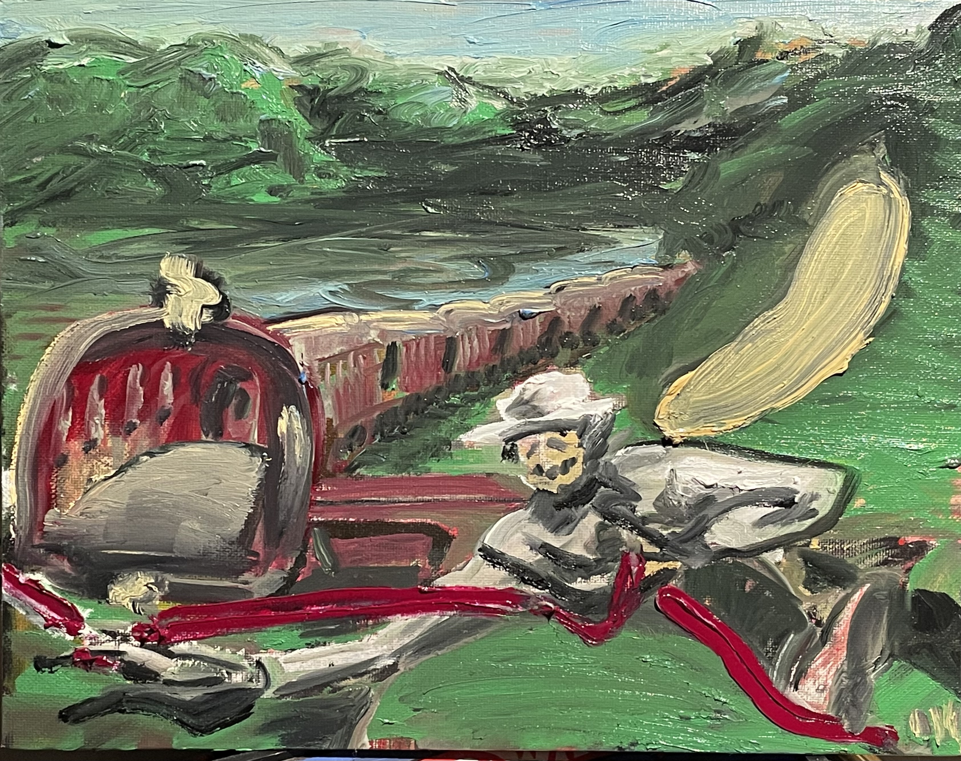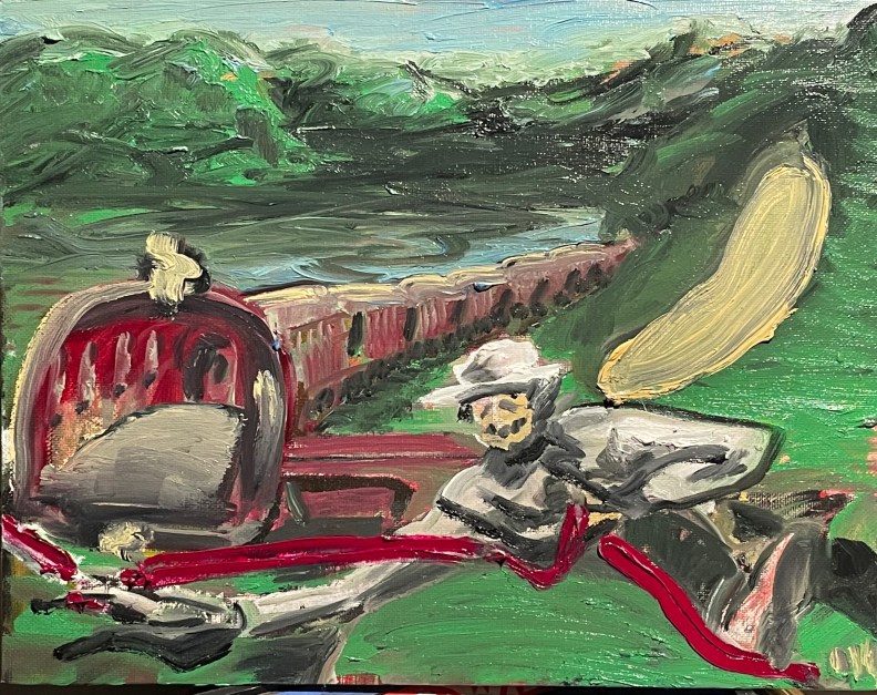 A tenacious cowpoke holds onto a giant chameleon’s tongue with a furious grip as he is yanked backwards towards the [climate change] gullet of the ravenous giant lizard that would soon call a string of empty passenger rail cars by the lake ‘home’, and a ’shopped banana