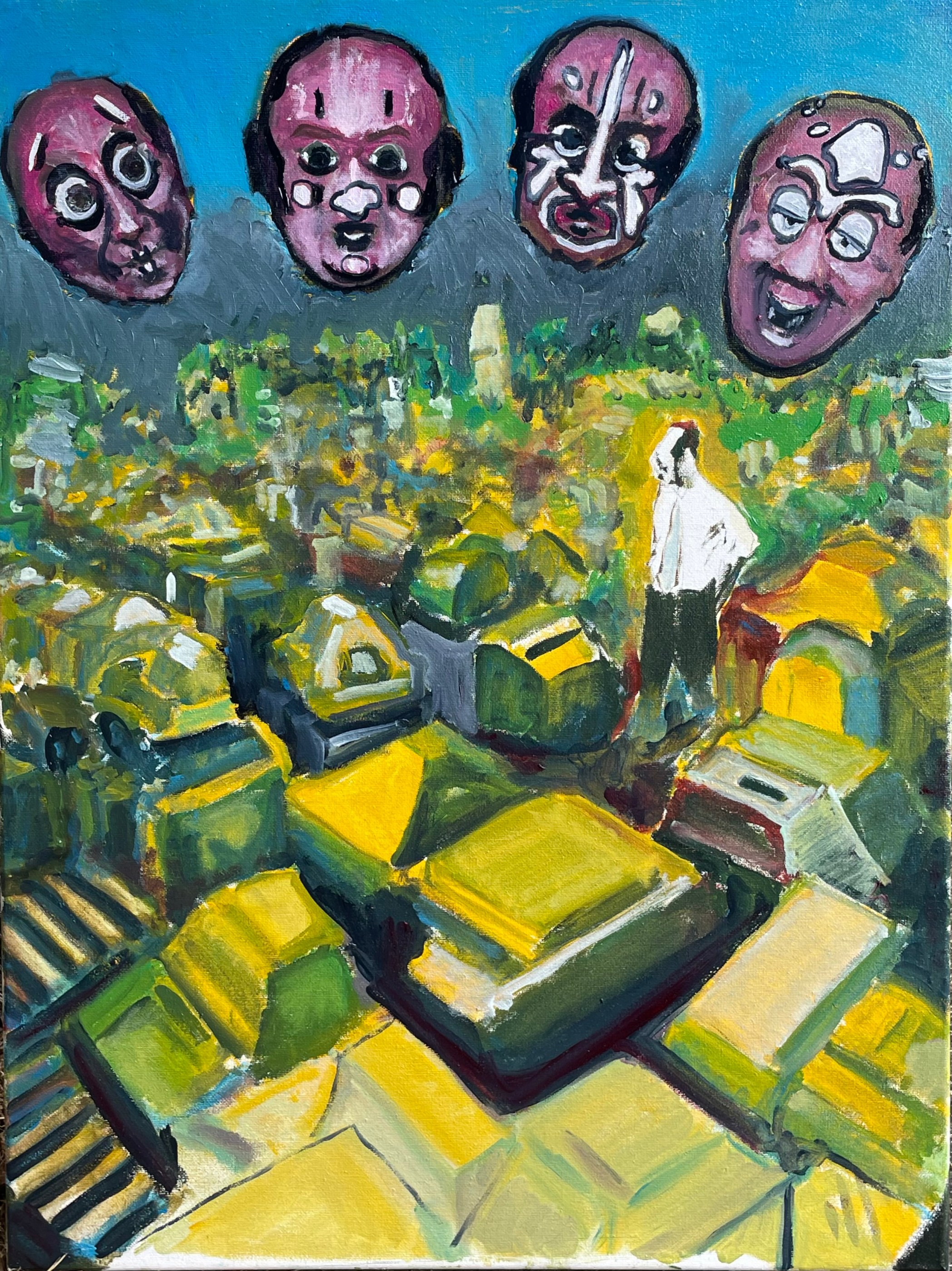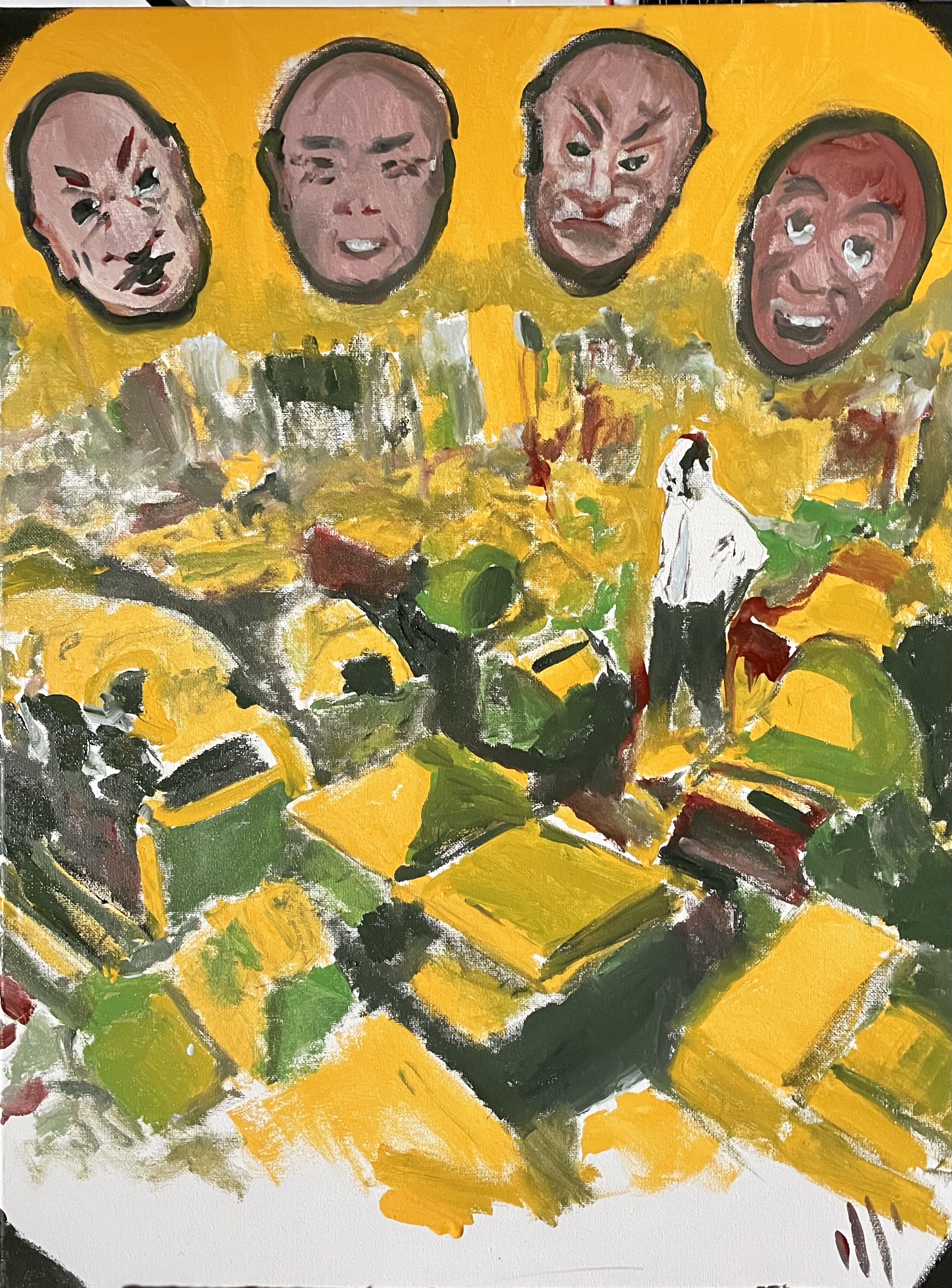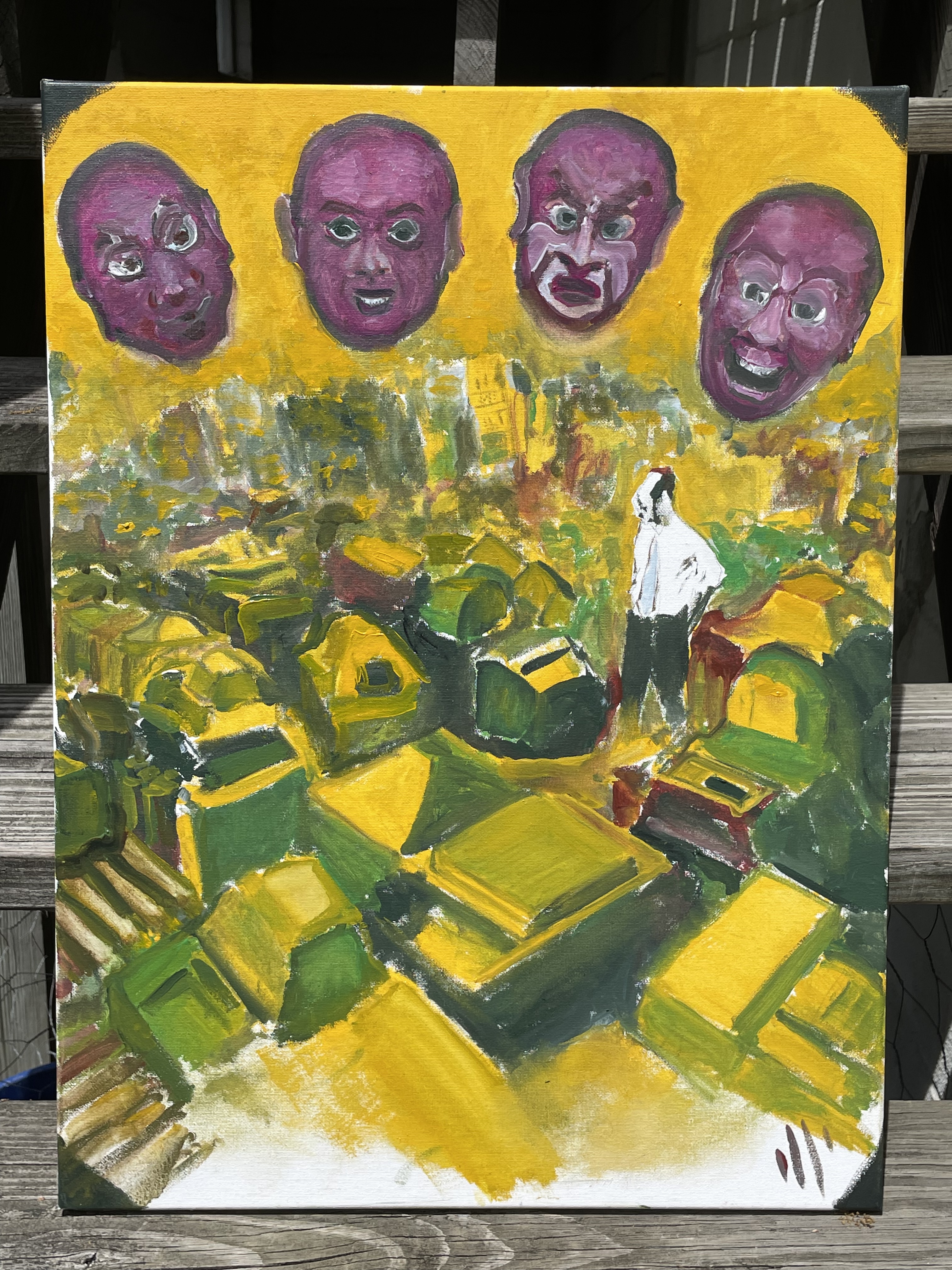 I have a lot of yellow paint. Those hovering faces need more context and detail, some cool tones.