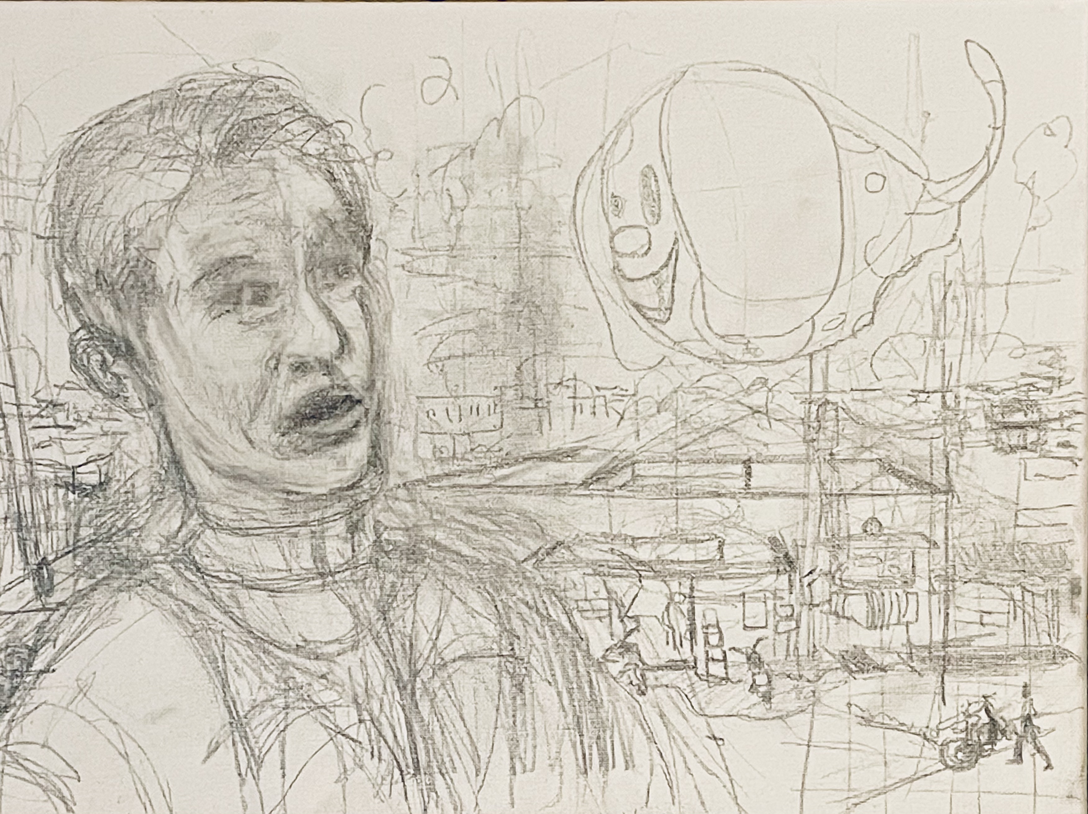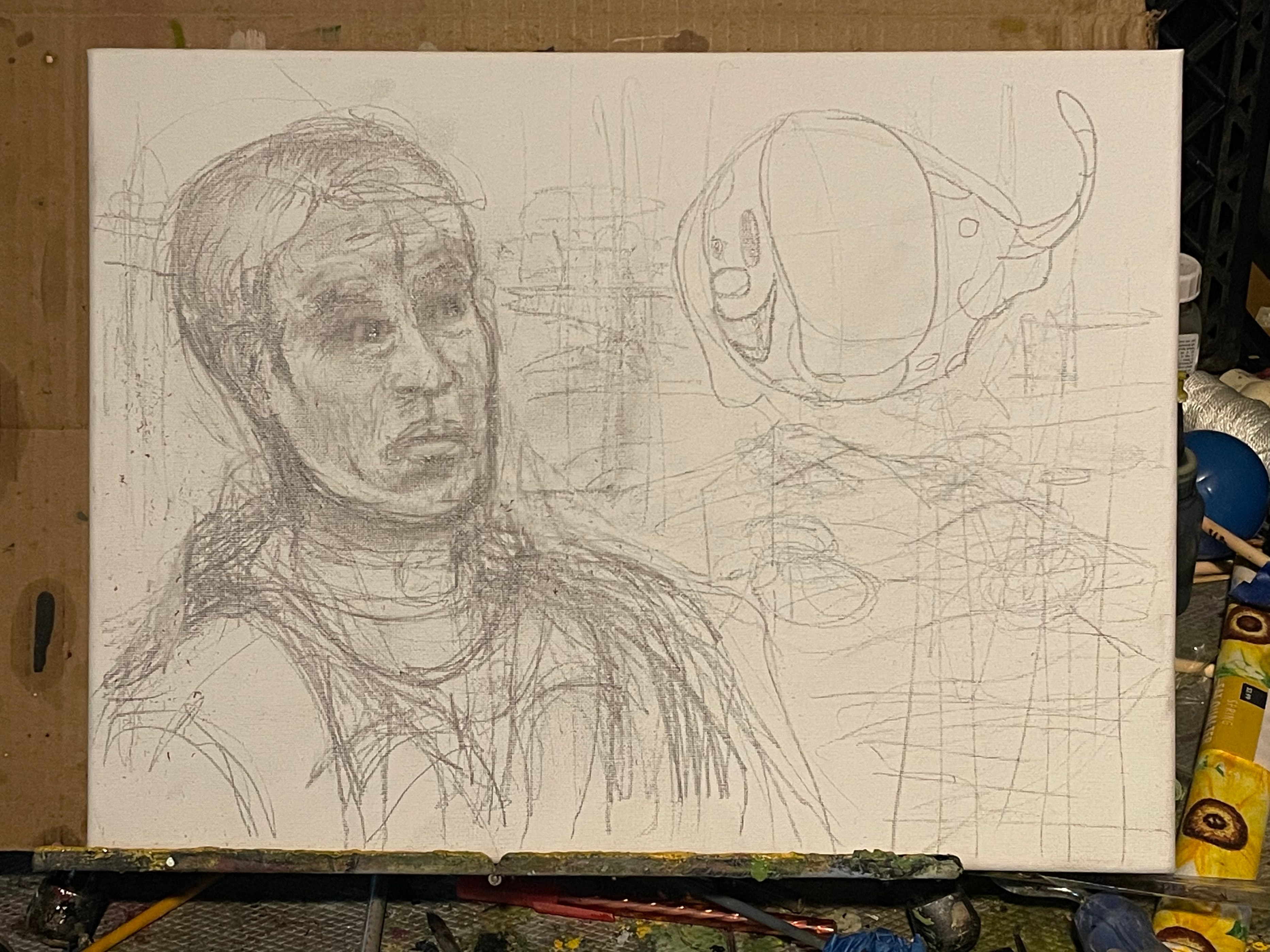Oil on canvas, 16”x 12”. Everything will be contoured, then filled with washes. Crumbs. Bits of words. Will use Liquin on this one, alternating Liquin and boiled linseed oil.