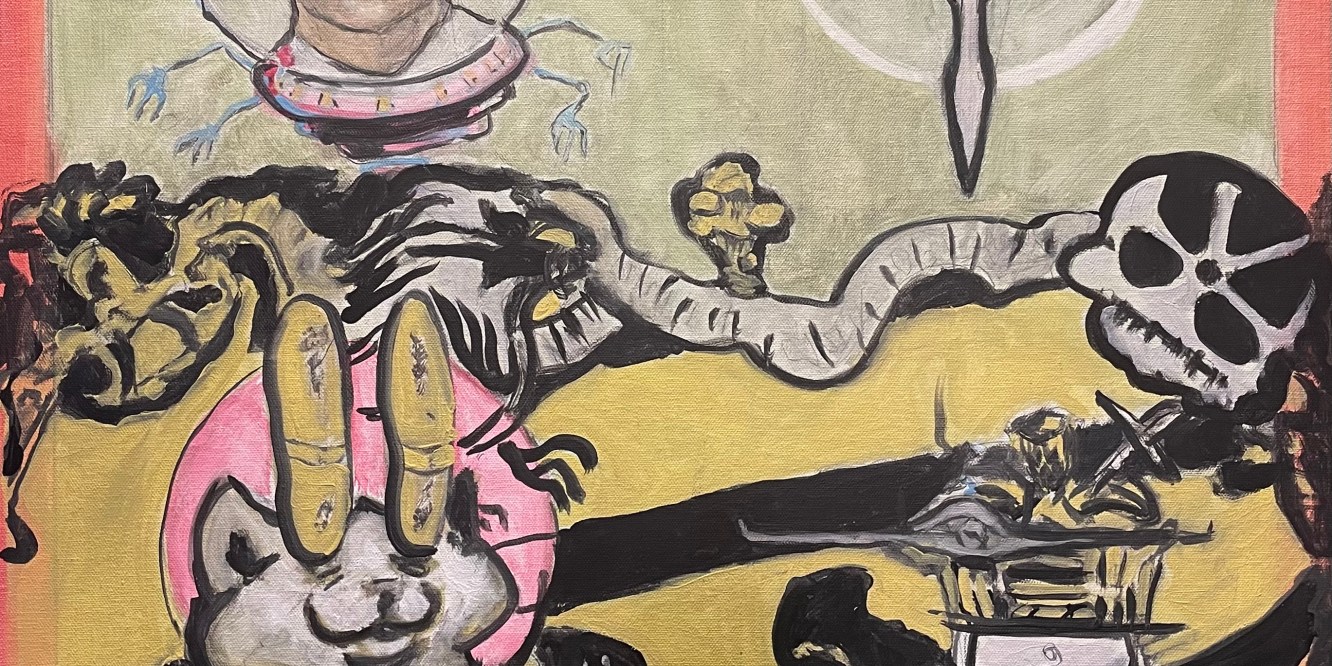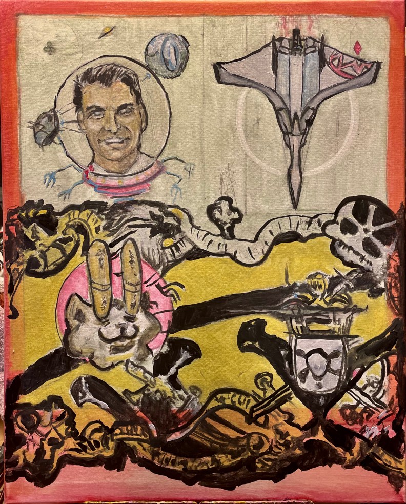 I chose this over a goose in an apron. I was going to paint a fat beady-eyes goose in an apron eyeing the viewer as it emerged from tall grass wearing a leather apron. Full of blackened steel smithing tools on clips. Like Weaponized Kitch. Old vintage truck at a pump with flowers growing out of it, carved out of a block of SPAM. Skyline made of friendship beads on safety pins. BBQ slow cooker in the rumble seat of an electric Rolls Royce.