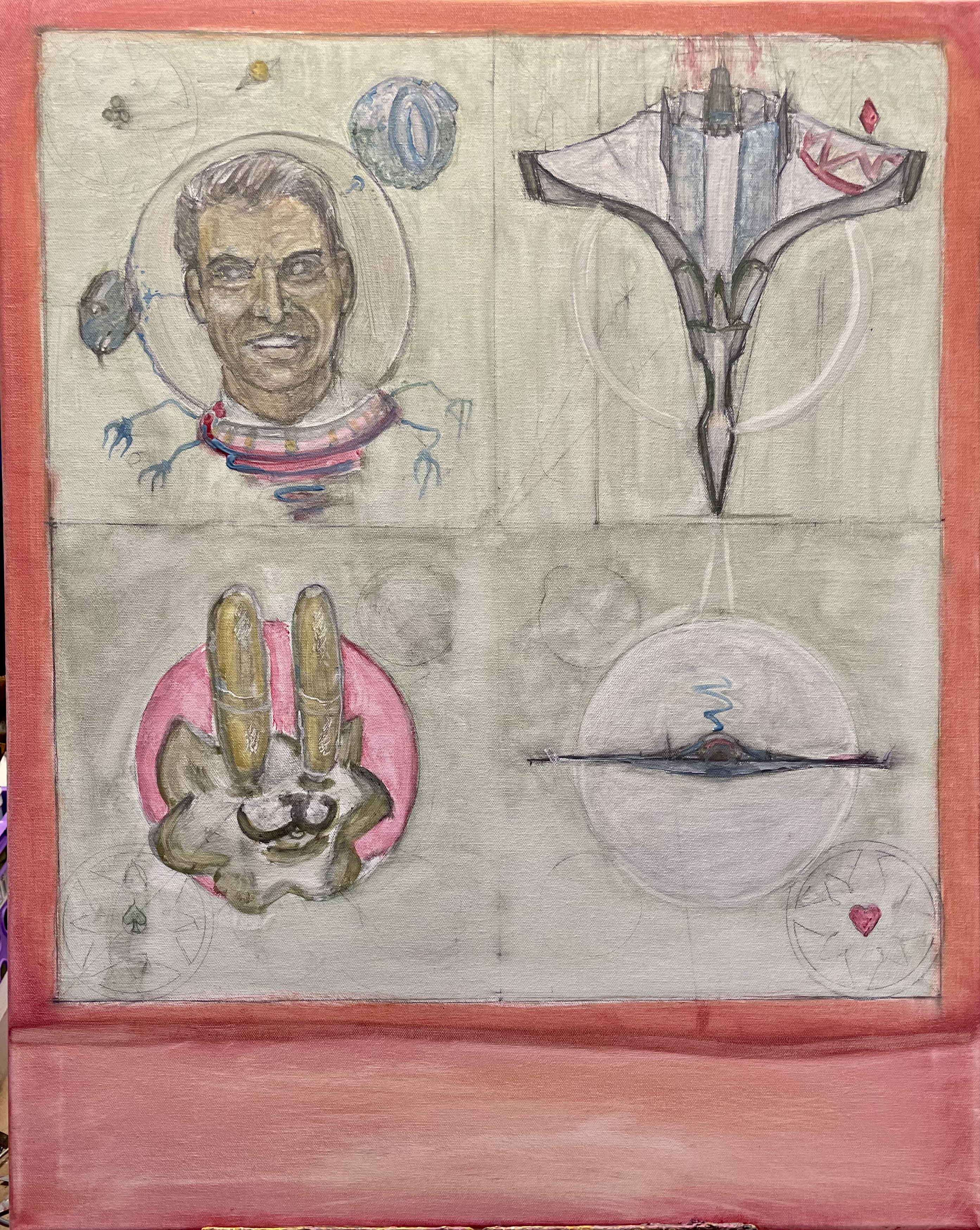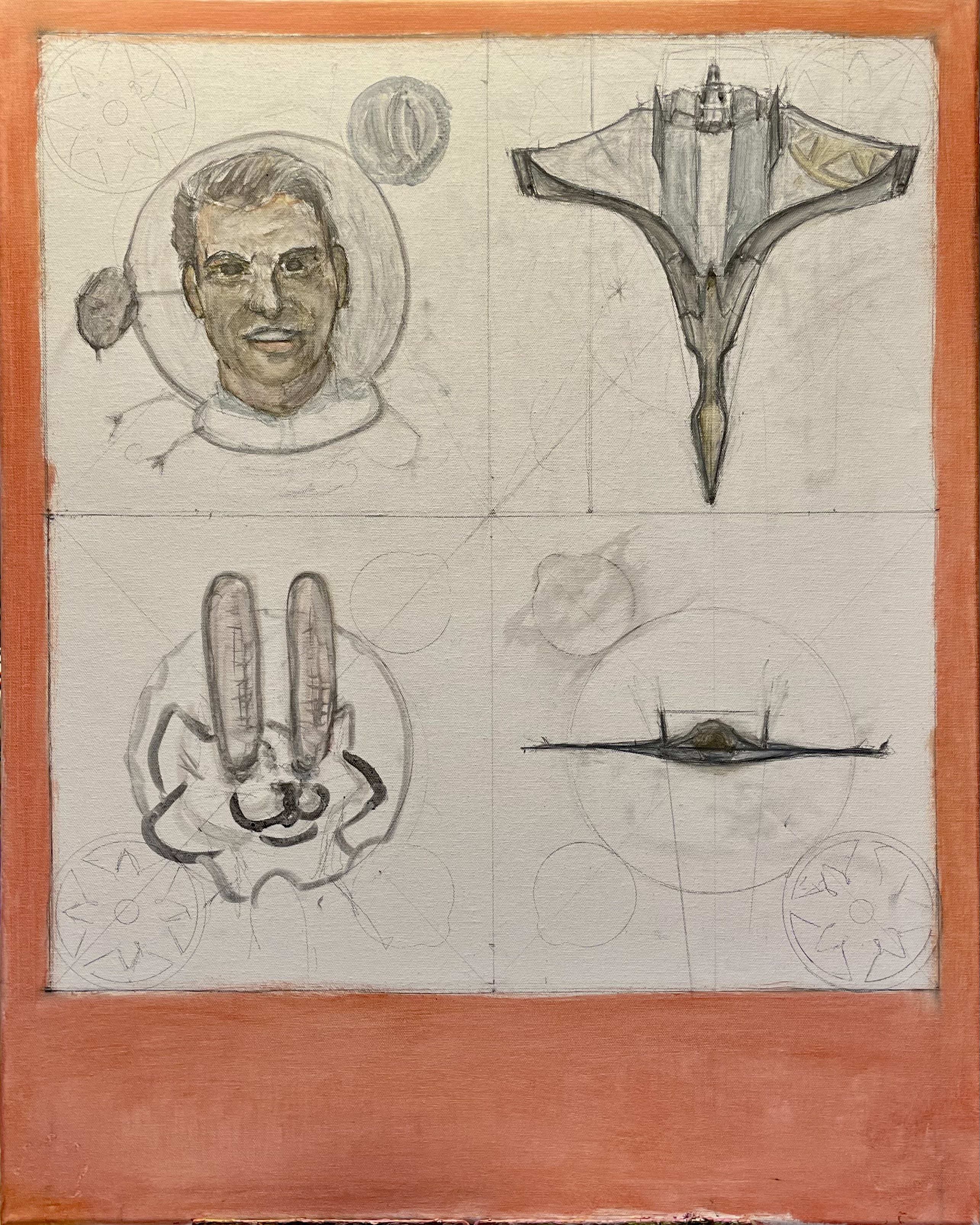 The image consists of four square panels, 2×2, with an open area below, like an architectural drawing. So, clockwise, we have …