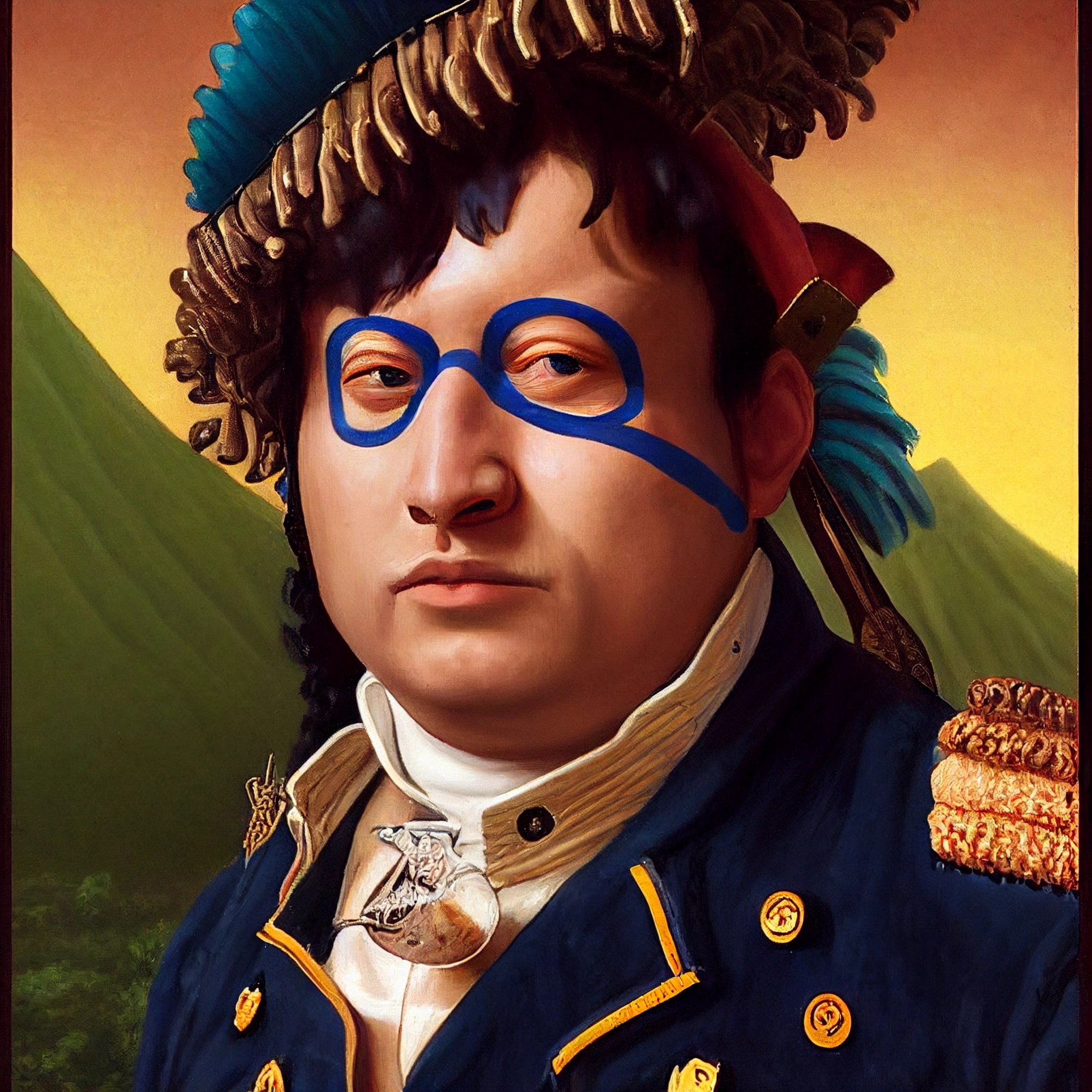 Midjourney got freaky with warpaint. It put the churros on Napoleon. Crowned with frybread. I thought Midjourney might take advantage of Napoleon’s habit of posing for photos with a hand shoved in his waitcoat to portray calm and firmness. Right. Shot the nose off the Sphynx.