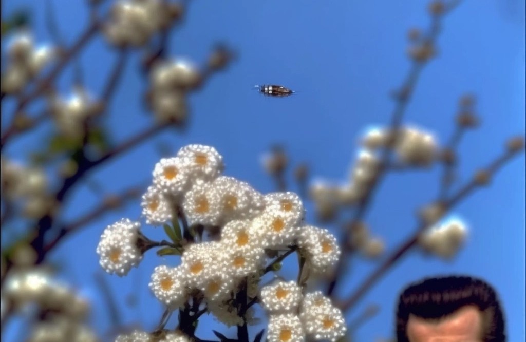 Pixar animation of Conway Twitty, Conway Twitty sitting in a field of flowers, happy, center of a field of wild flowers, dynamic interaction of light on hovering honeybee wings, light on flowers, Conway Twitty is watching a bee fly between flowers, 8K, volumetric lighting, lens flare, mid-day, low contrast, normalized, detailed, insane detail, shadowplay