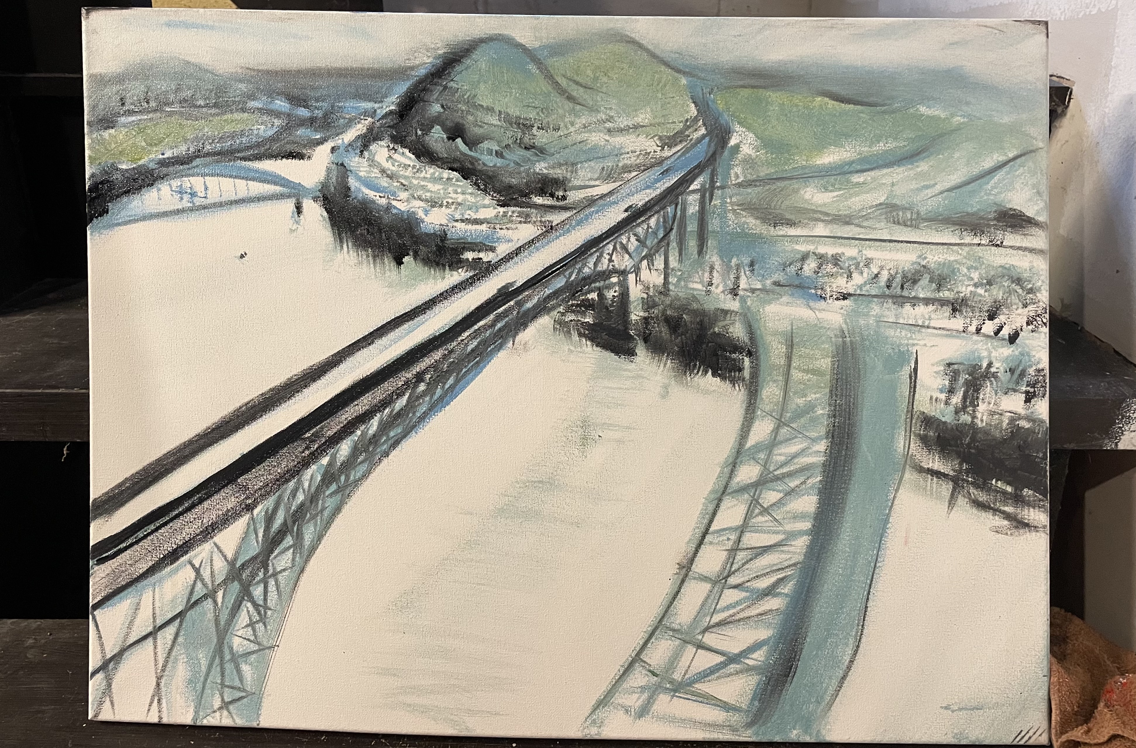 I go back in two weeks to paint in fall foliage, add detail, for ten minutes.