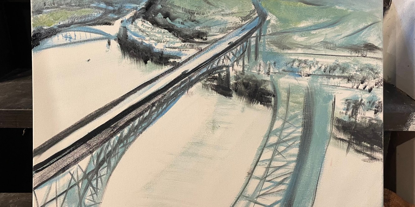 I go back in two weeks to paint in fall foliage, add detail, for ten minutes.