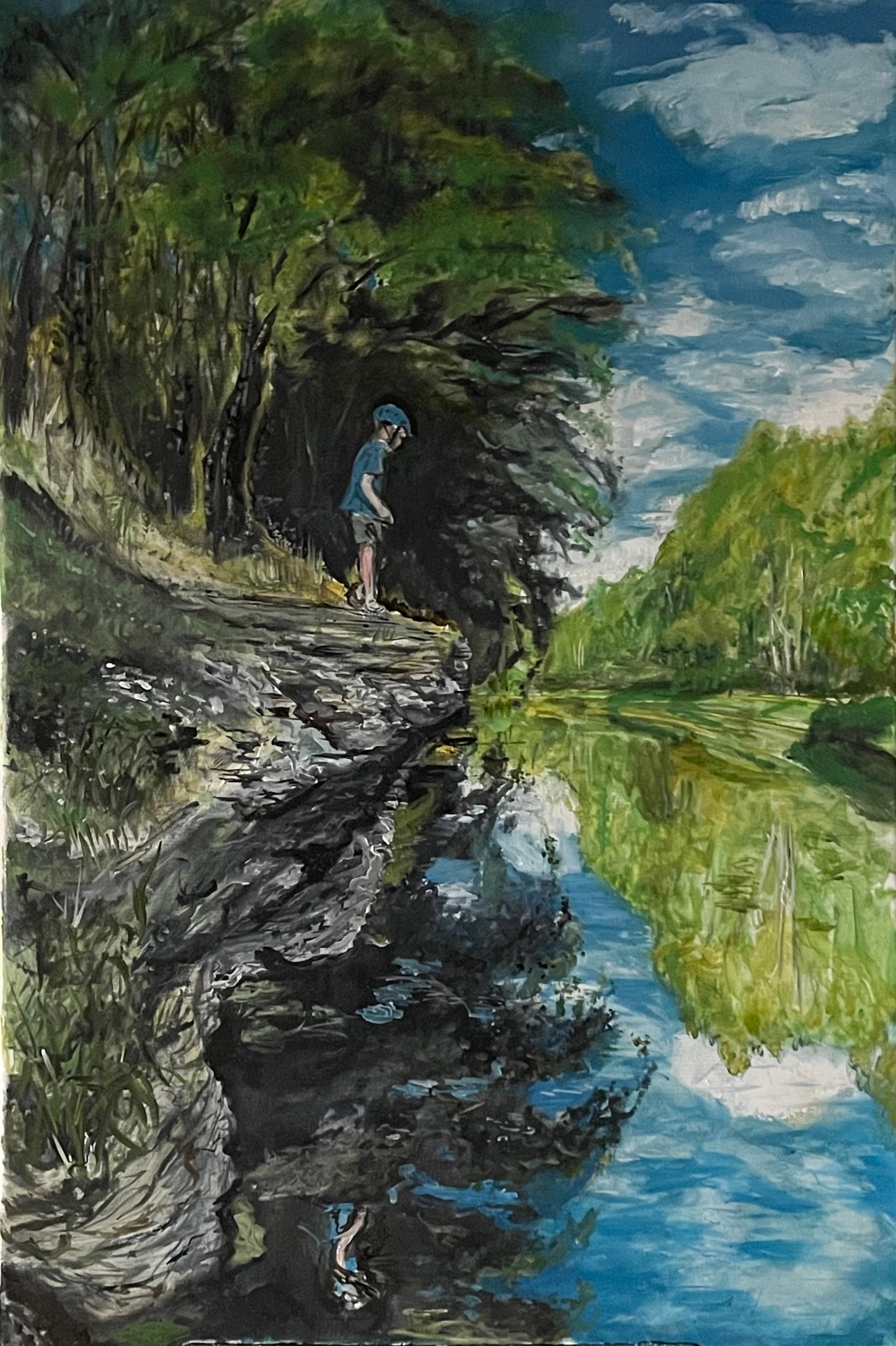 By fiftystatebanana Posted on February 24, 2024February 26, 2024 Oil on canvas – “Cedar Run at Deep Creek” Accessible by bike trail. My other son goes, cool, paint me next! I This photo was from 2023. Dimensions: 2 ft. x 3 ft. I like the aspect ratio for a painting about reflecting In LED lighting In morning light Share this: Click to share on Reddit (Opens in new window) Reddit Click to email a link to a friend (Opens in new window) Email Click to share on Mastodon (Opens in new window) Mastodon Like Loading... Related