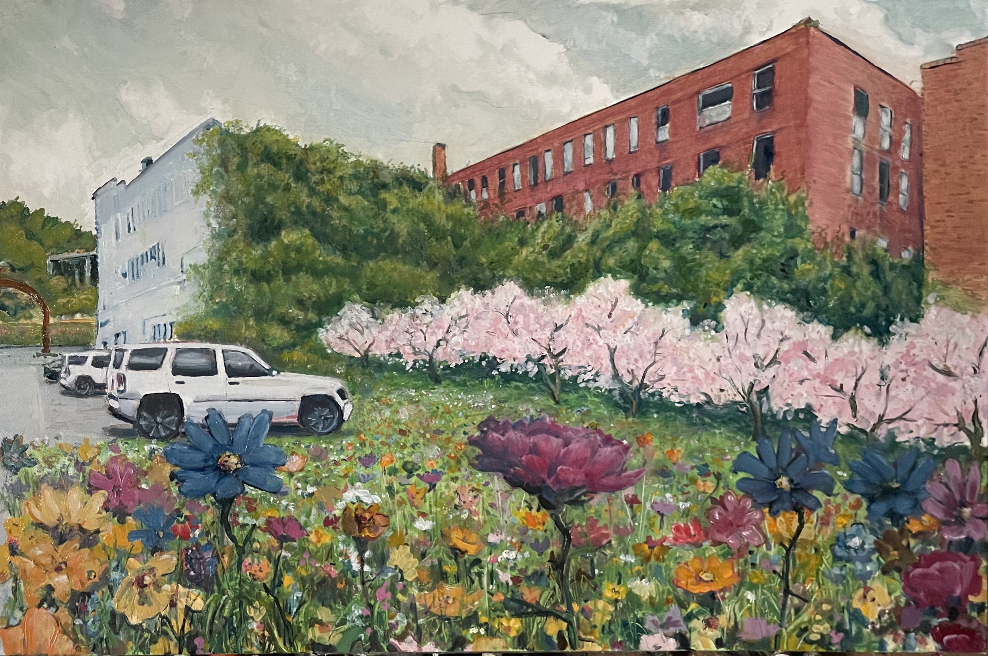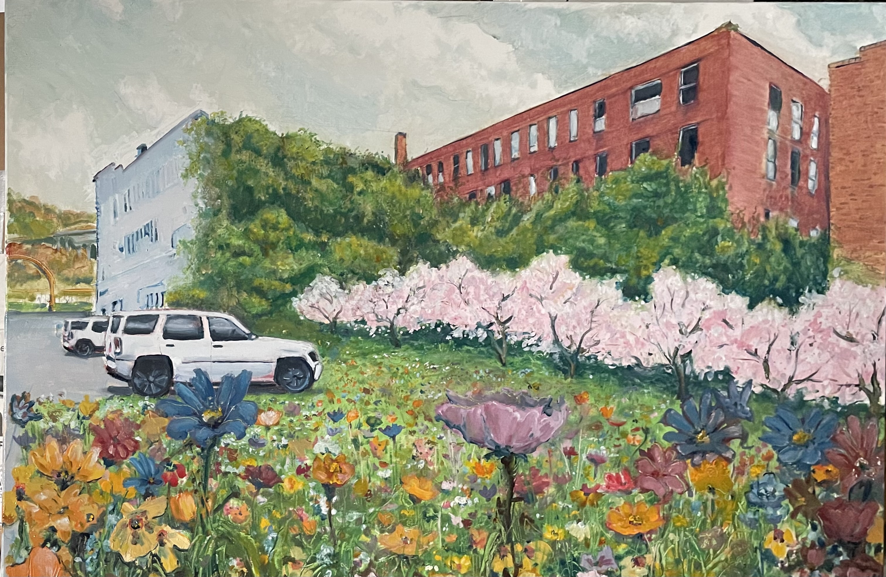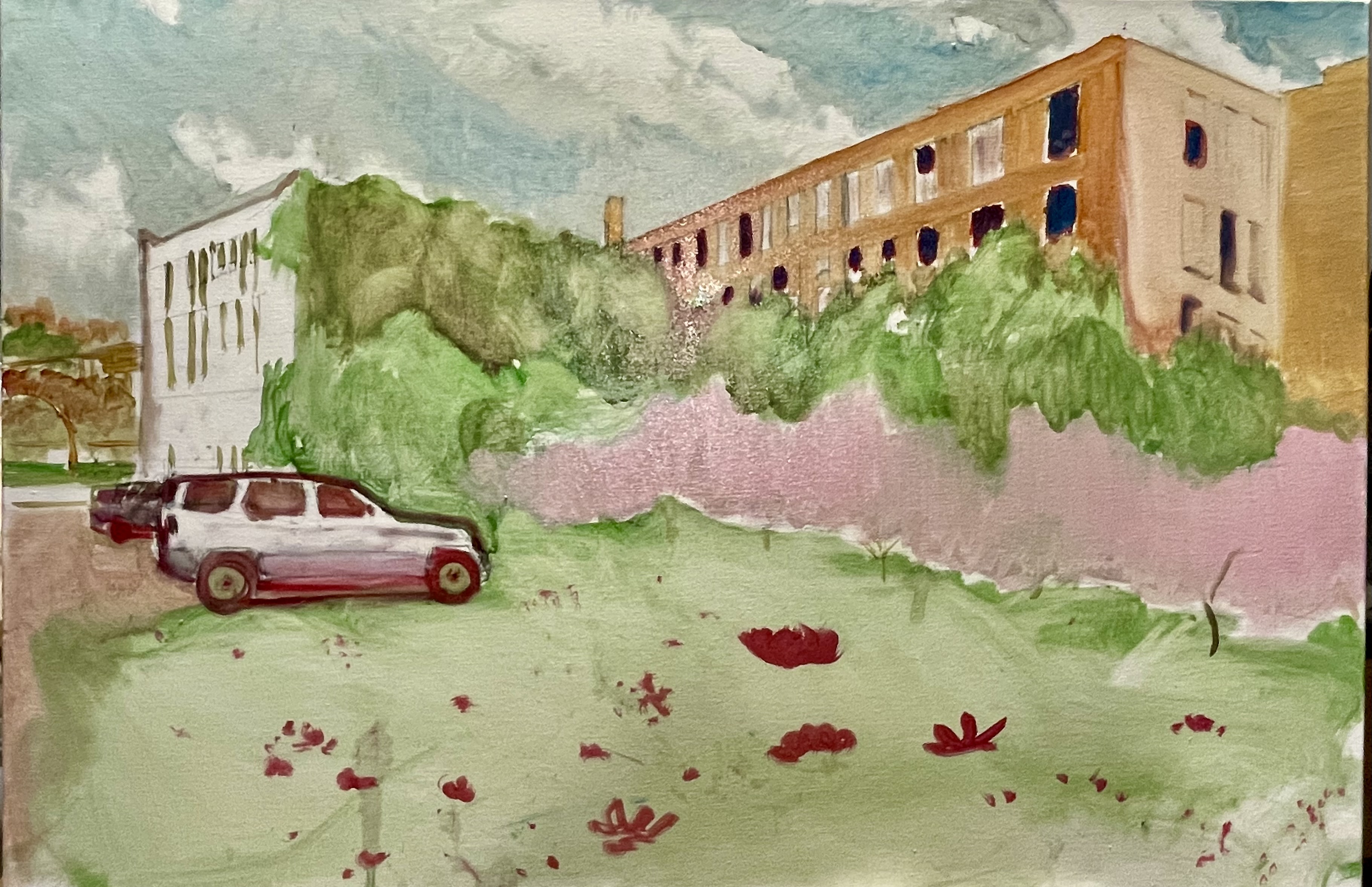 The tone is wrong, but the redraw is passable. I will go back over the sky once the profile is defined. The building hue will be a neutral light grey, a white in the distance. I used the car windows to give me a tone. This sets me back three days. The rest of the painting, save for some tacky globs, is dry. I will be putting in defined flowers. I needed a thicker and smoother underlay than the gessoed canvas.