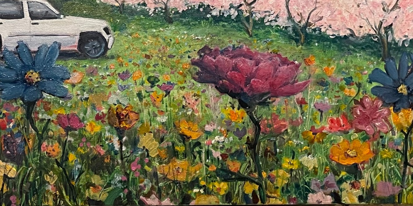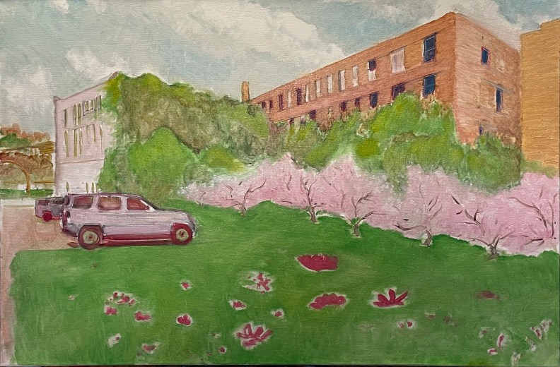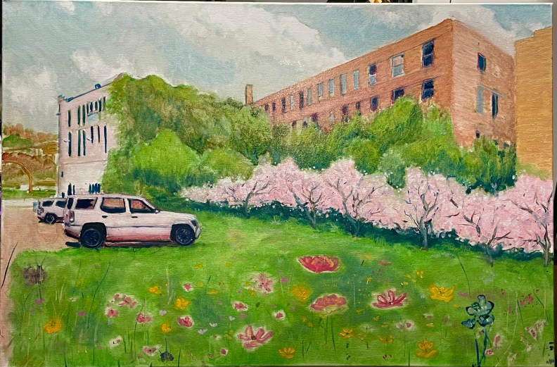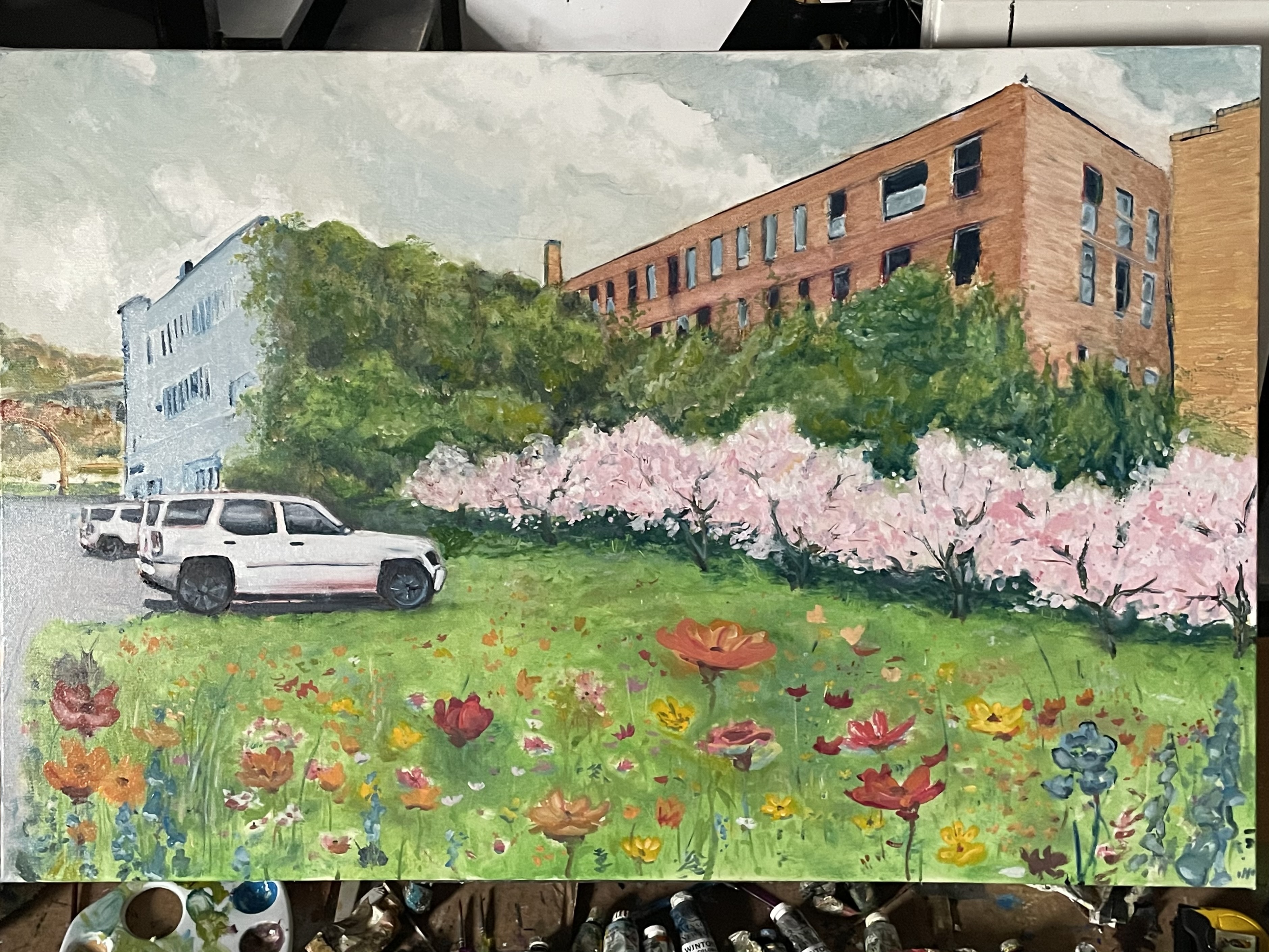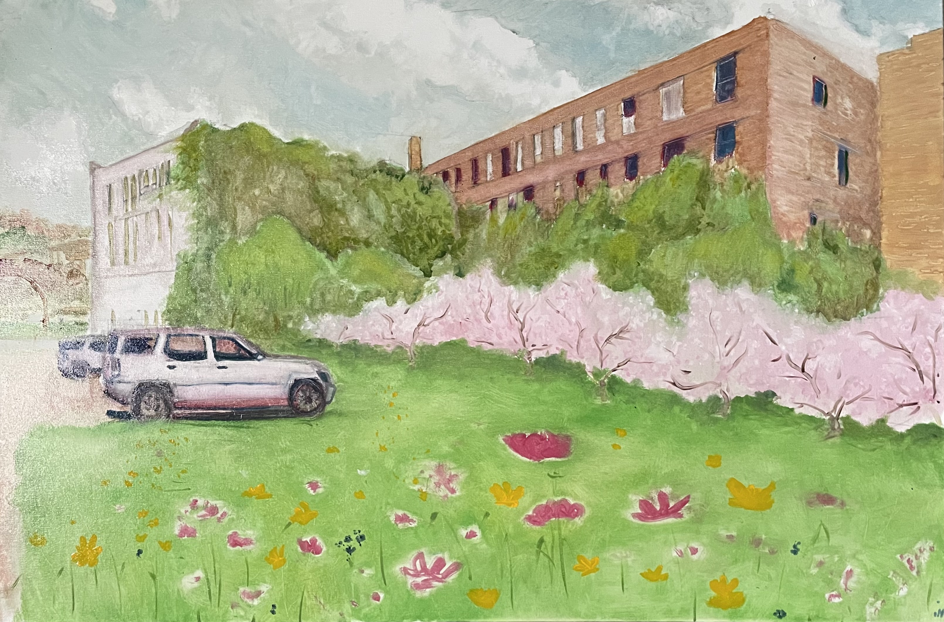 The tone is wrong, but the redraw is passable. I will go back over the sky once the profile is defined. The building hue will be a neutral light grey, a white in the distance. I used the car windows to give me a tone. This sets me back three days. The rest of the painting, save for some tacky globs, is dry. I will be putting in defined flowers. I needed a thicker and smoother underlay than the gessoed canvas.