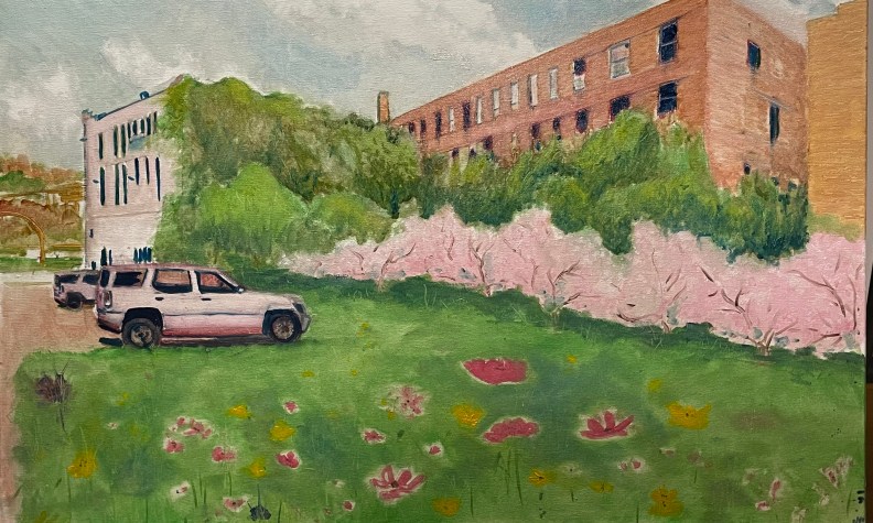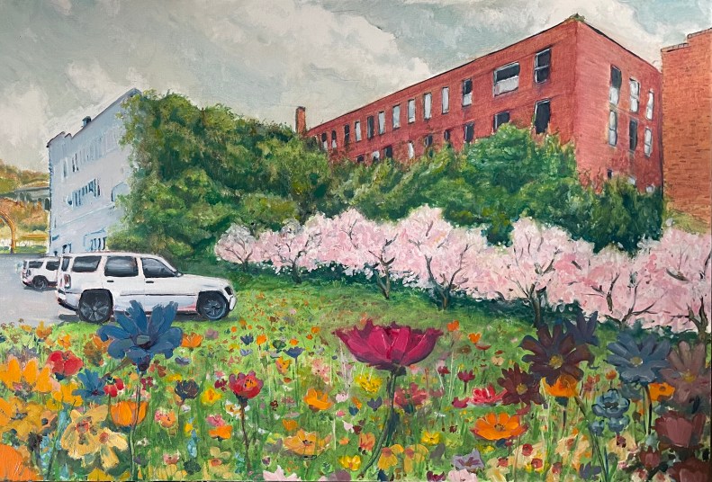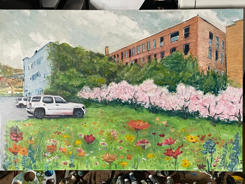 So, look at the building on the left. Its perspective is incorrect. I worked on that. I took the sunset out of the window reflections. I want to fill the foreground with flowers, but the left side of the painting is flat.