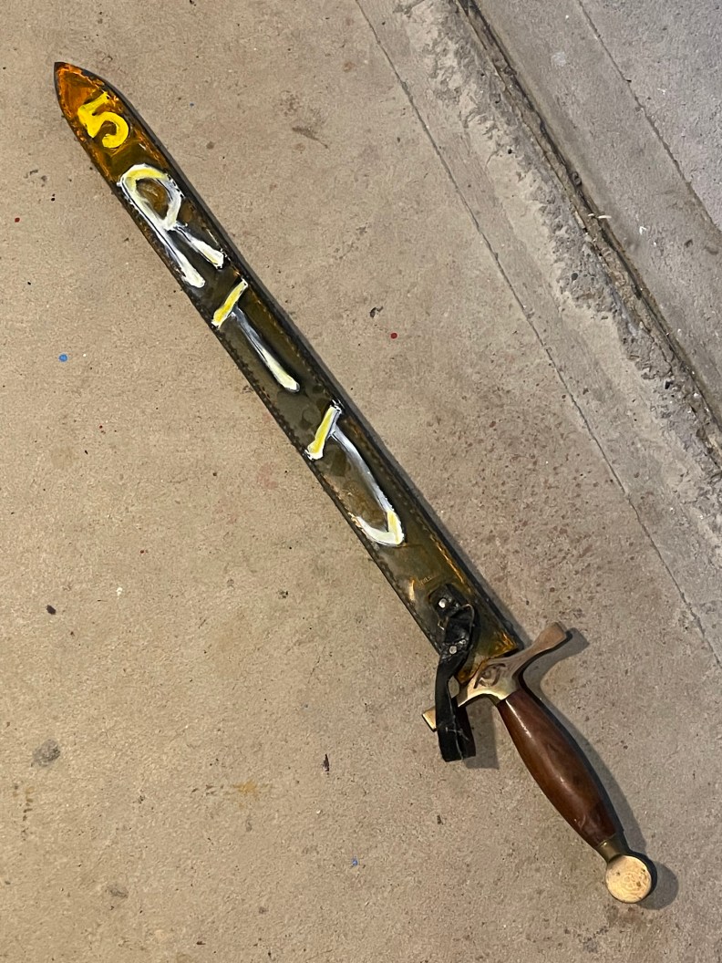 By fiftystatebanana Posted on May 4, 2024May 4, 2024 RTJ 5 decorative sword Leather scabbard, oil paint, real sword bought at a yard sale for a quarter, nine years ago. Share this: Click to share on Reddit (Opens in new window) Reddit Click to email a link to a friend (Opens in new window) Email Click to share on Mastodon (Opens in new window) Mastodon Like Loading... Related