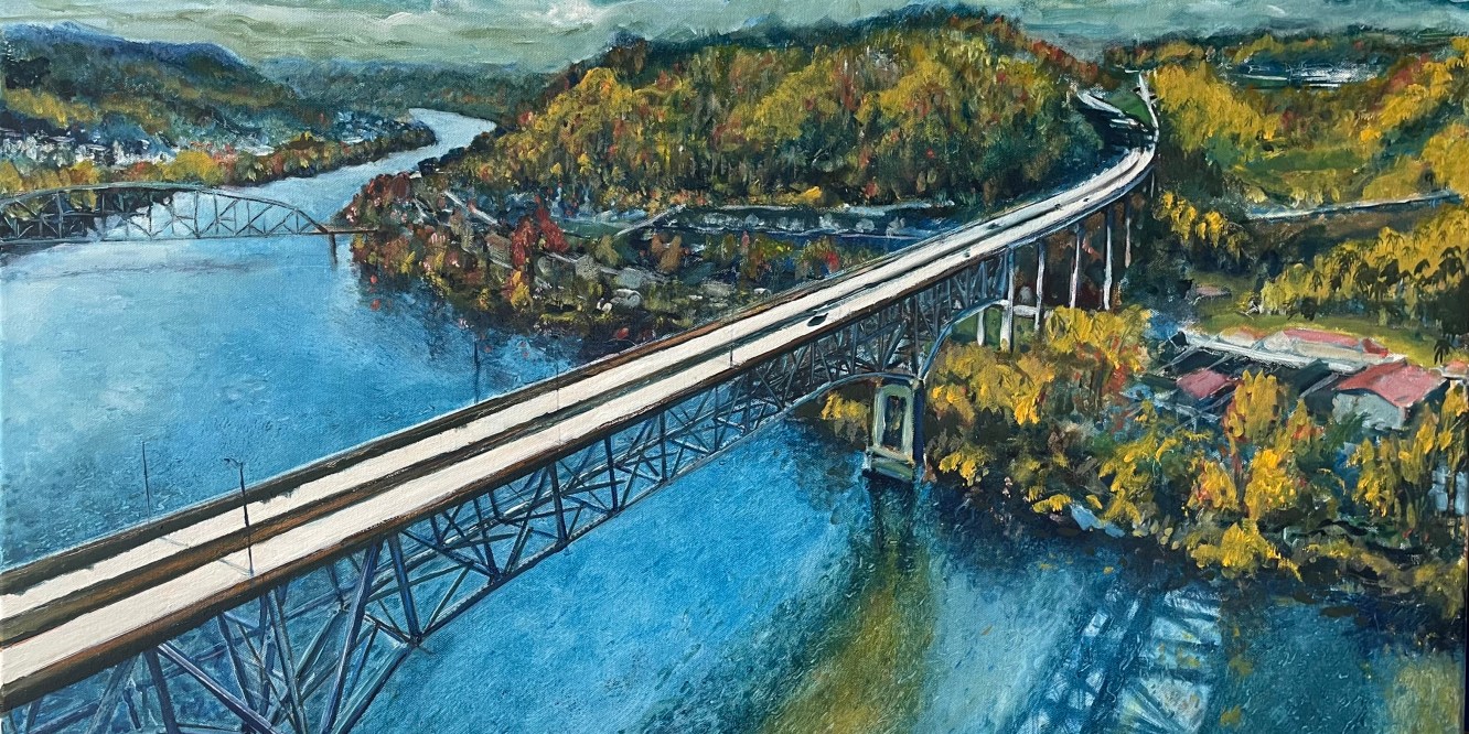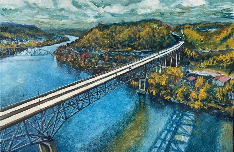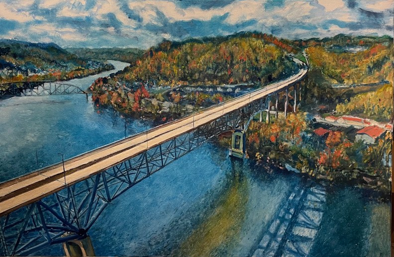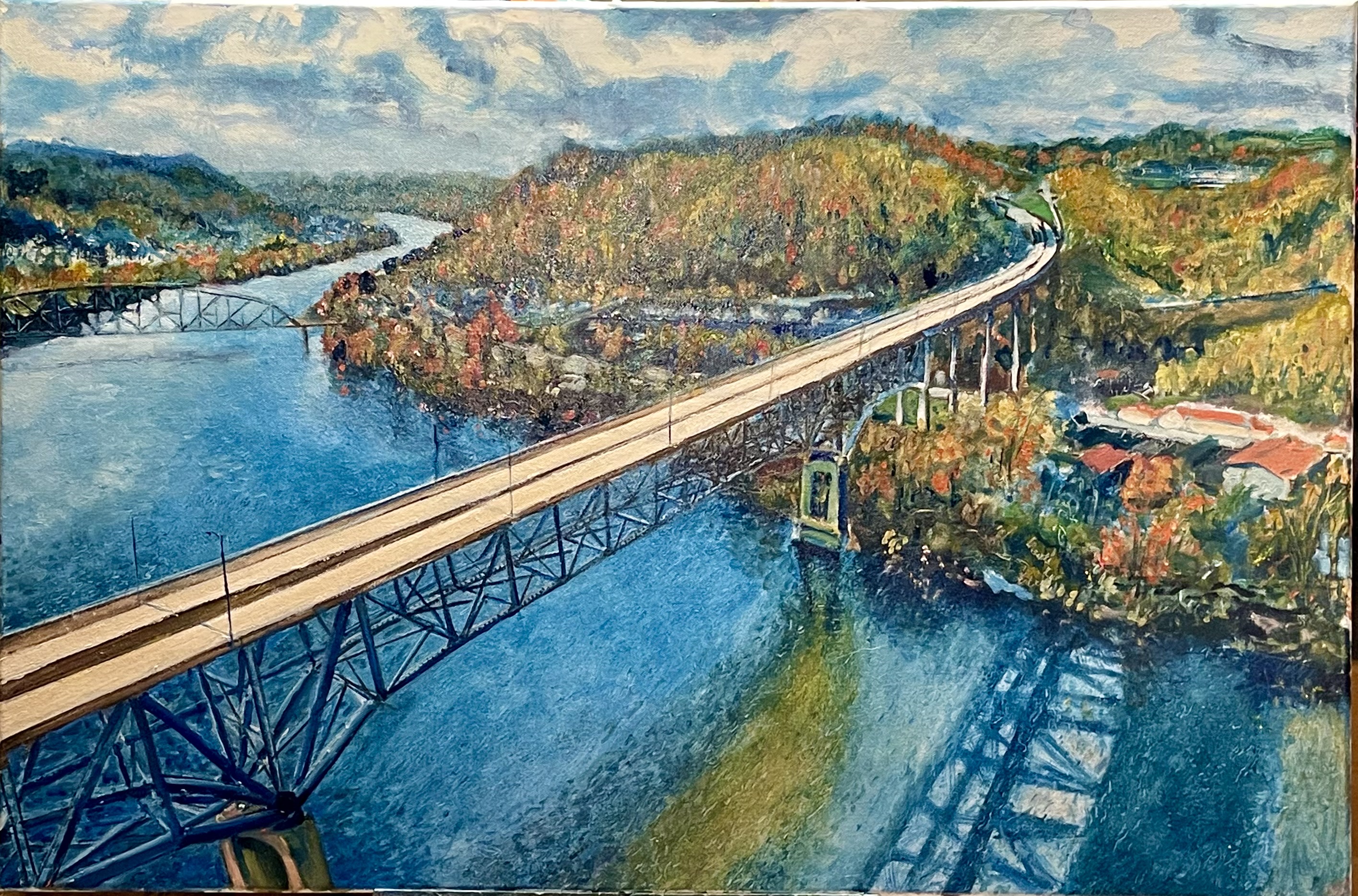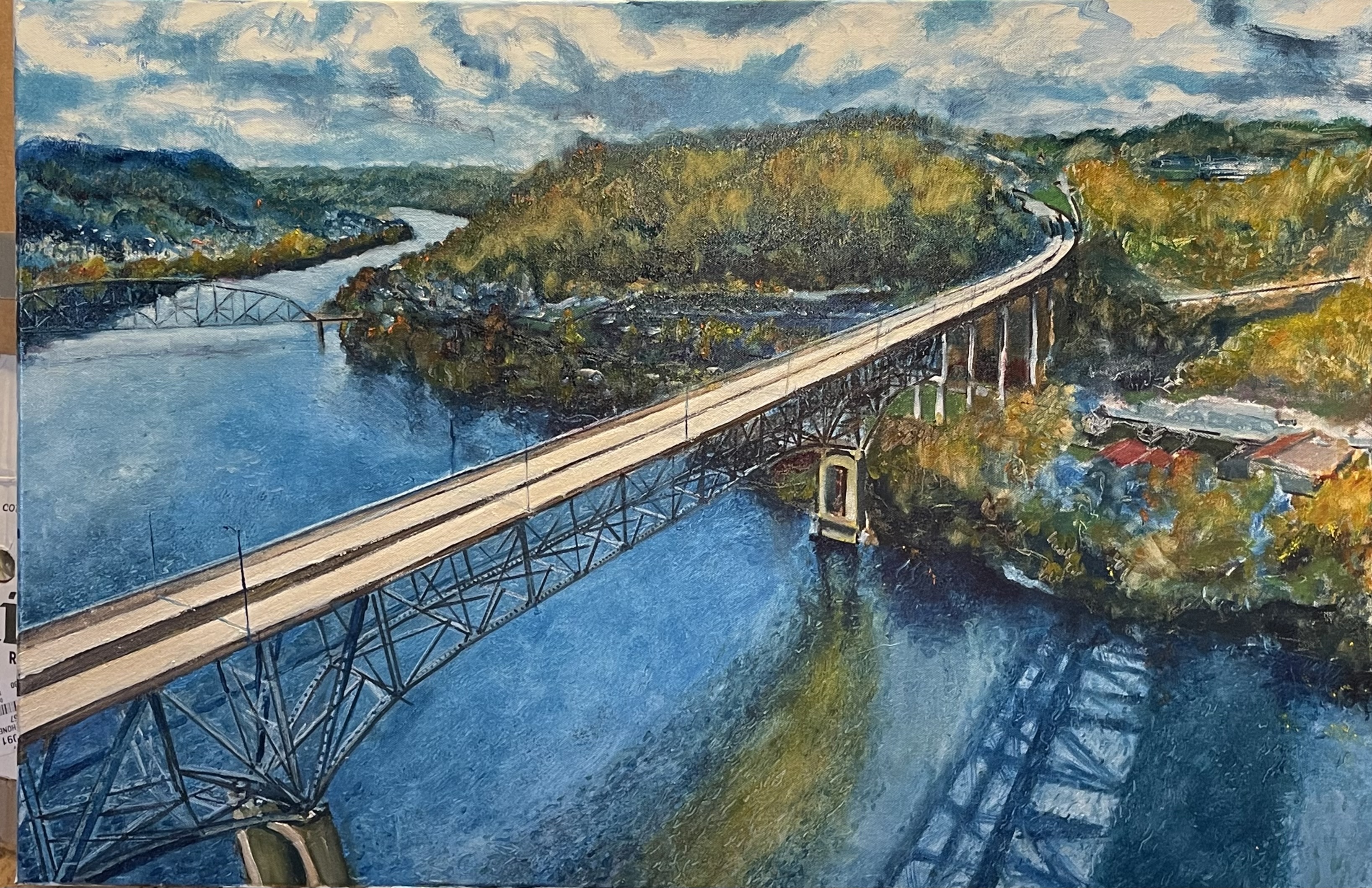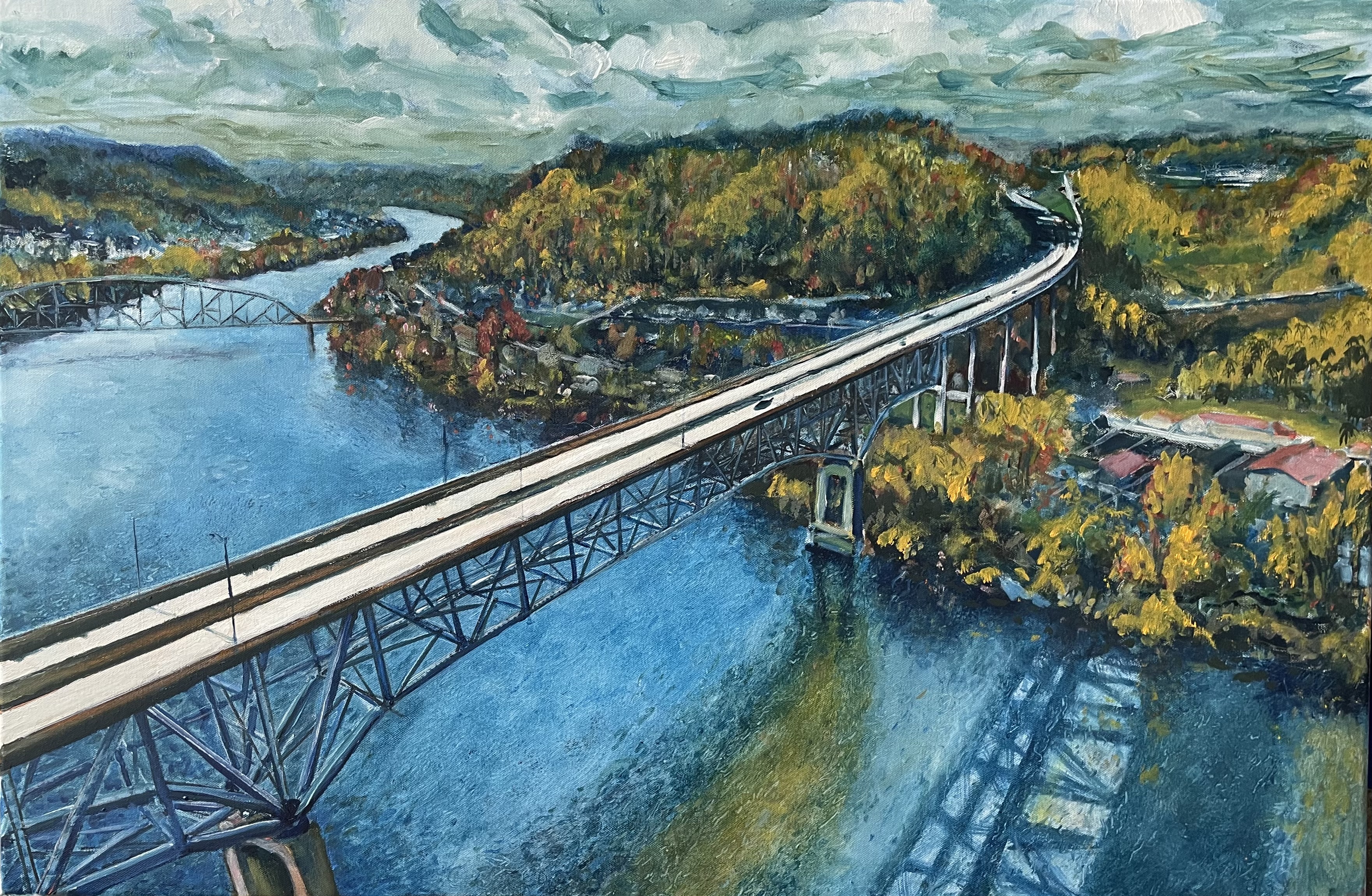 thousands of trees and branches, a revisit to the foreground truss and pylon. Using red. Need to dumb down the sky and its reflection, render the concrete of the overpass a faded grey. This bridge killed this town. You could pass this town in 30 seconds.
