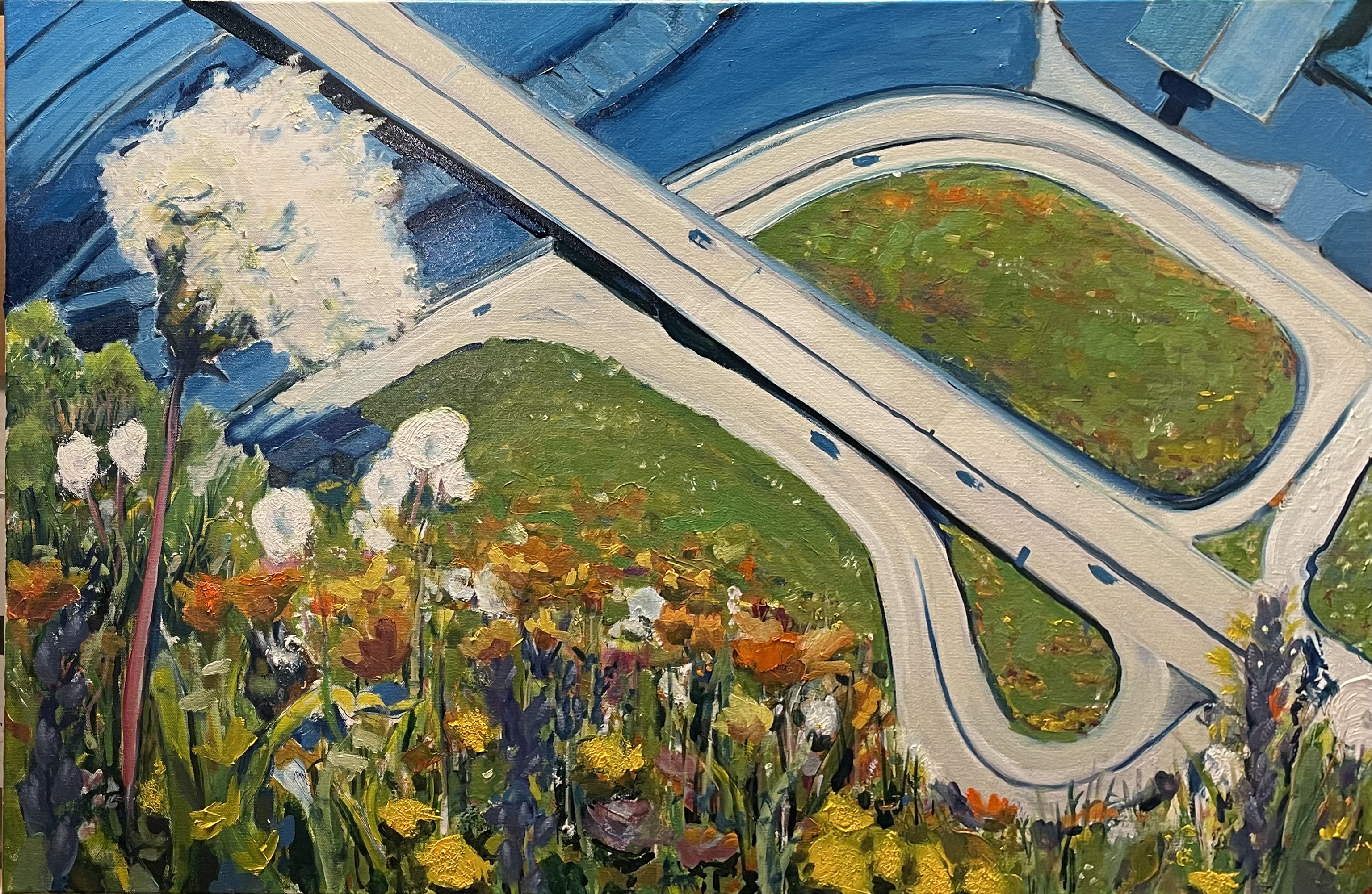 It resembles a melting film projector. This was three sessions. The sketch, color, definition. Now I thread dandelions into the tall grass, brighten everything, as though light was coming through it from behind. The road will get a makeover. I will shift tones to show the central area left of the diagonal road is a forced perspective transformation.