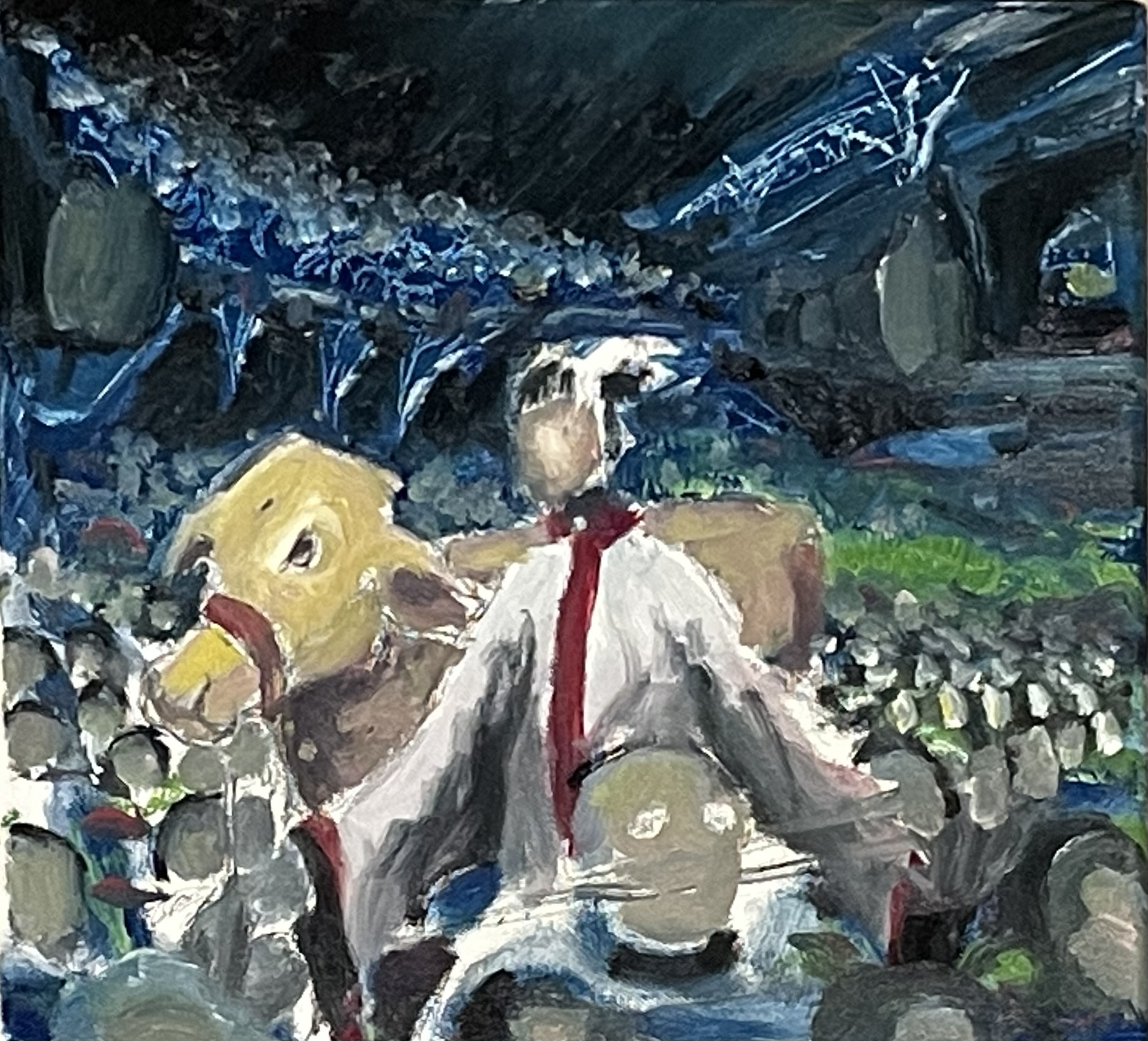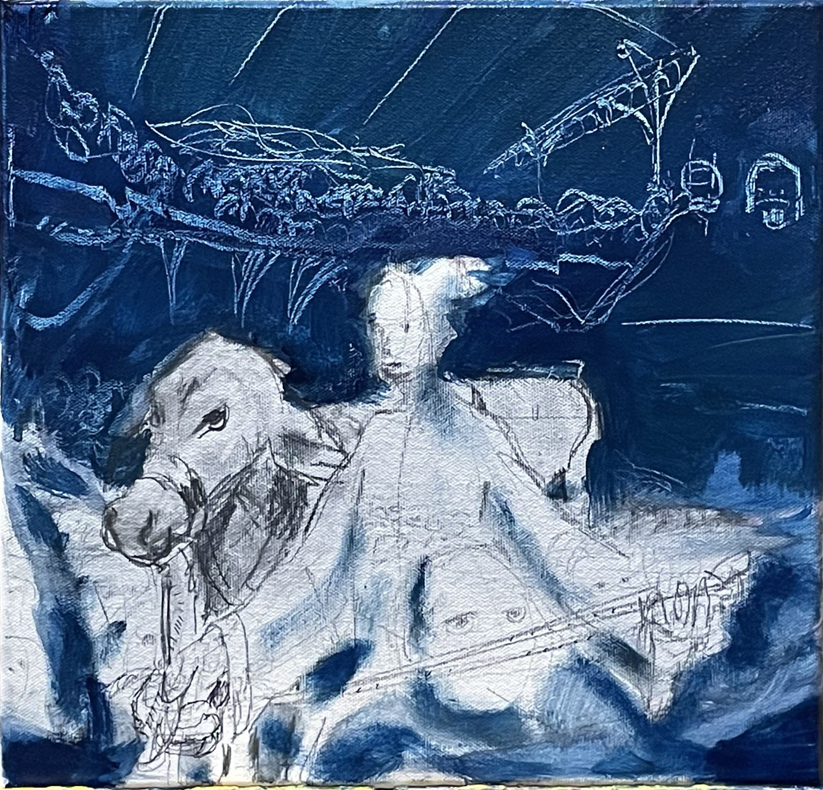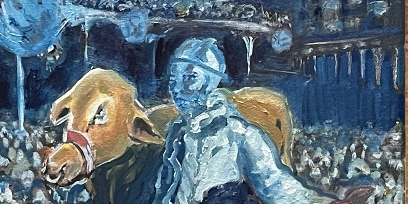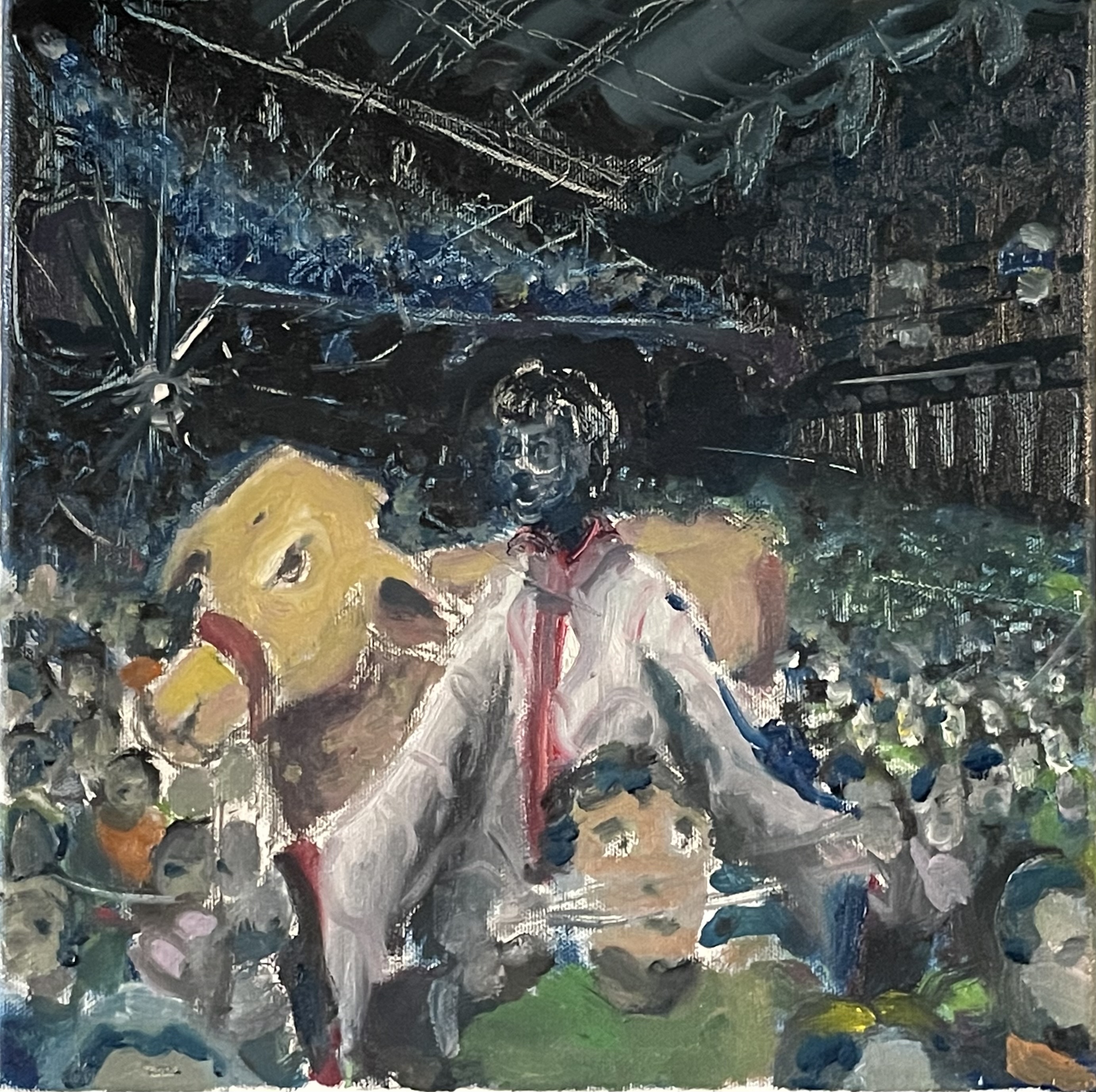 Dream of watching audience watch a movie on the screen, view from behind screen, quick study. I picked an old style theater with a horseshoe balcony section and a private box on the wall. The character is handling a rope absentmindedly. The cow and the character are, of course, watching something none of us can see.