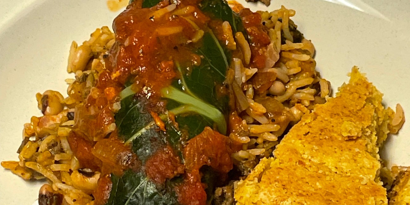 Income Tax Swag Hoppin’ John with Collard Green Bankrolls and Cornbread. This is my traditional New Year’s Dish. Click the link for recipe.
