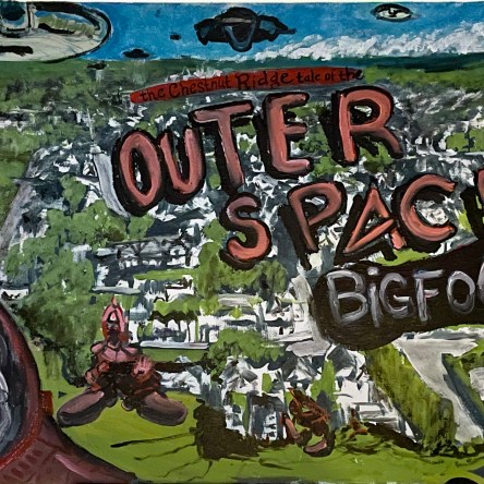 16”x 20” This poster features two local supernatural tales, the Kecksburg UFO, and the supposed landing of outer space Bigfoot creatures that were driven off with shotgun blasts. Why not … Continue reading Space Bigfoot at Chestnut Ridge Poster, oil on canvas, in progress