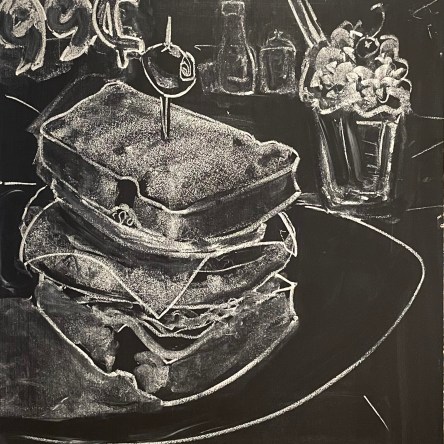 A portrait in chalk on prefab ‘blackboard’ panel Here today, gone tomorrow, forgettable eyes, nice guy.
