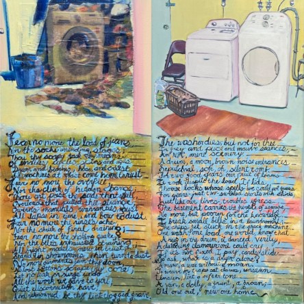 In the style of Shakespeare’s Cymbeline funeral duet “Fear no more the heat o’ the sun”, etc. This is for a two-panel comparative work between an old school artist like … Continue reading “Funeral Song for a Dead Washing Machine” – mixed media on canvas in progress